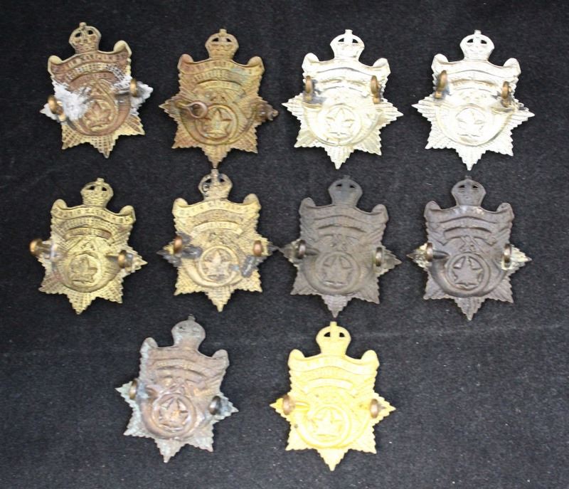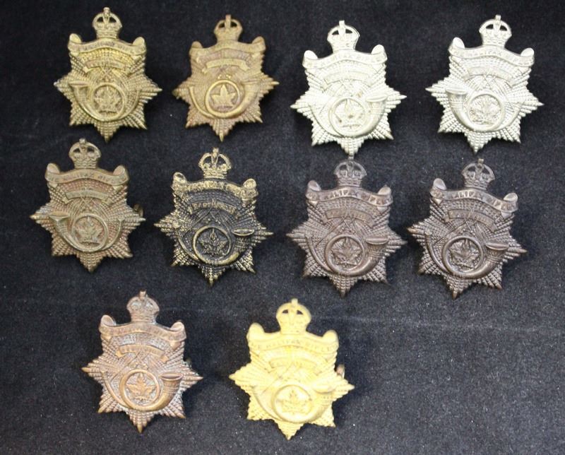 3 - pairs, white metal, dark brown coated, brass with one having one lug removed and one remaining and the other has replaced lugs, rest have lug fasteners. 4 - Singles, one dull gilt, one dark brass, one dark copper/bronze and one dull dark brass, all lug fasteners. Lot of 10. M97. 1933 issue.