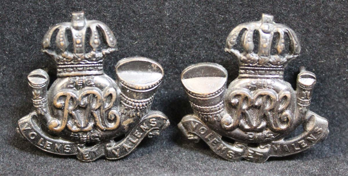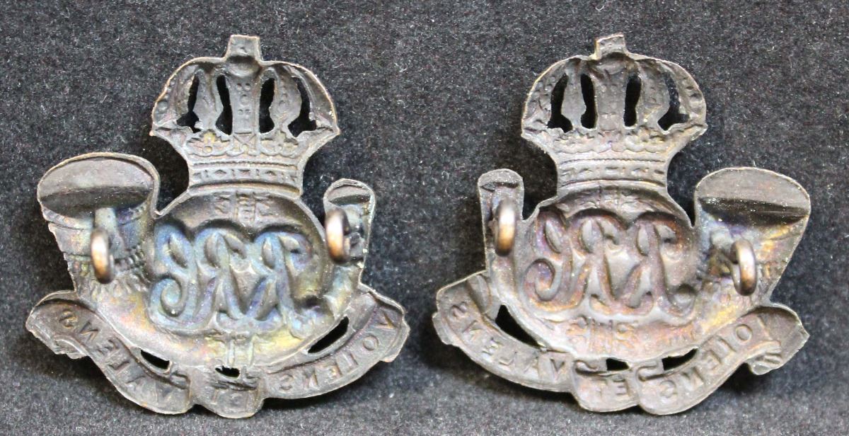 Matched pair, mouths of horn facing, black coated bronze metal with traces of bronze showing on high points, lug fasteners. Mazeas M15. 1928 issue.