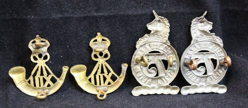2 - Mazeas M28, Royal Hamilton Light Infantry, brass metal, Mouth of horn on both to right, lug fasteners. 2 - Mazeas M166, Toronto Scottish, matched pair with Unicorns facing, white metal, lug fasteners. Lot of 4.