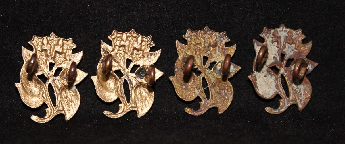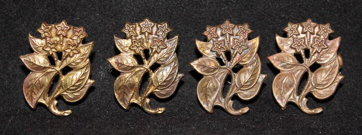 . 1929, Colchester and Hants. pair. Mazeas M135. 1939 issue, North Nova Scotia Highlander (M.G.), pair. All same design, Stars over leafs, lug fasteners, one dark brass and other lighter brass, all stem pointing to right, all SCULLY maker marked. The same collar used by both units. Lot of 4. Mazeas M115.
