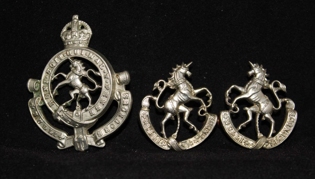 Cap white metal, Rearing Unicorn design, one lug removed, looks like an attempt to replace lug, solder remaining, slight darking to front left. 2 - Collar, matched pair, Unicorns facing, white metal lug fasteners, right facing one SCULLY maker marked.Lot of 3. 1 - Mazeas C4, 1937 issue.