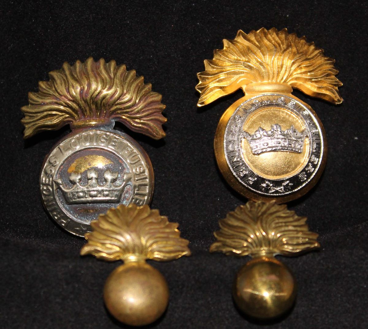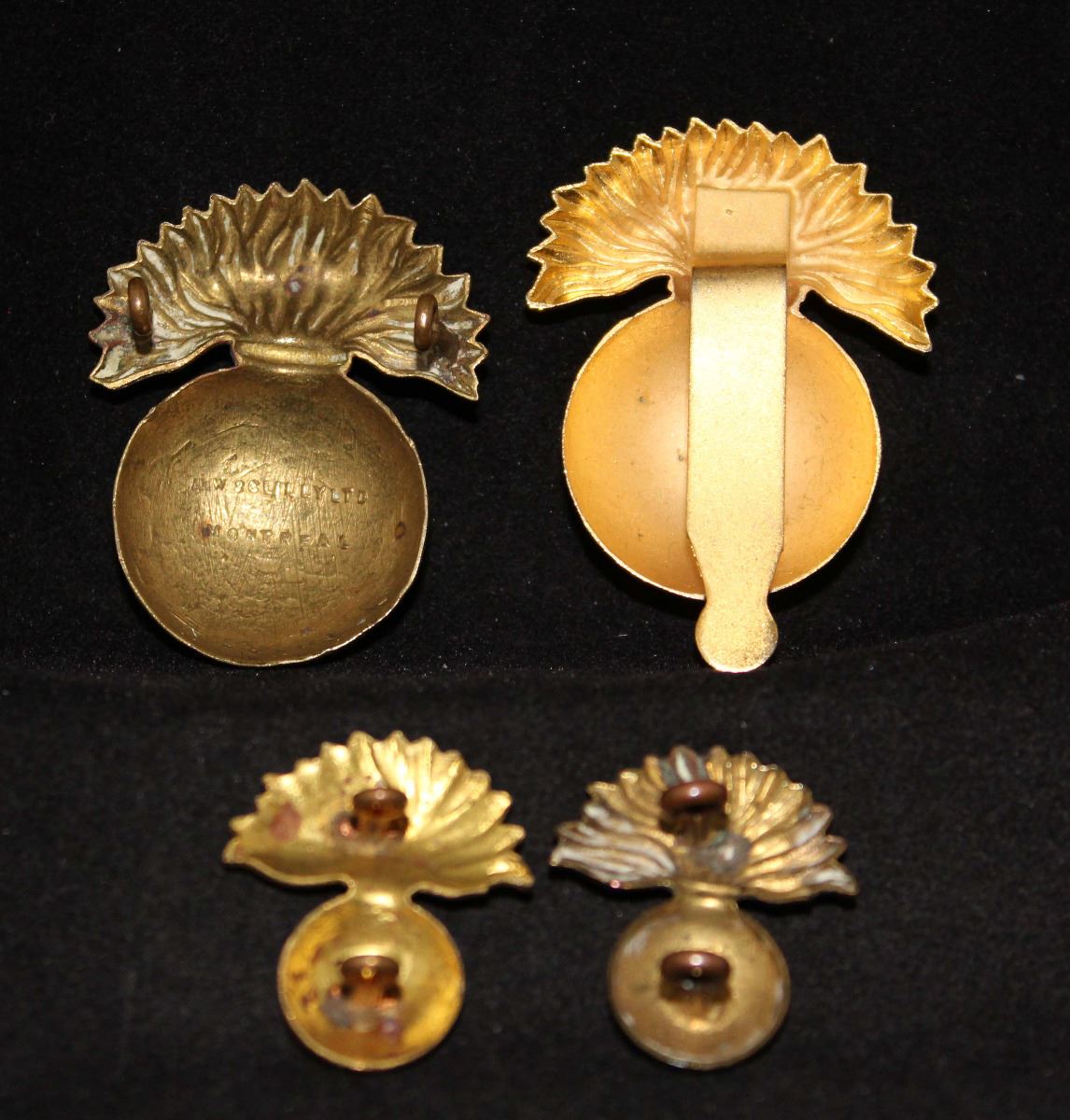2 - Caps, one - Mazeas M100, brass metal flaming grenade with white metal overlay, lug fasteners, SCULLY maker marked and one - Thompson Q59, dull gold coated flaming grenade with dull silver overlay, slider fastener. 2 - Collar badges, Brass flaming grenades, lug fasteners (NOTE Vendor states these collars quite hard to find). Lot of 4.