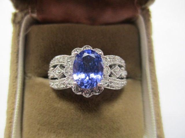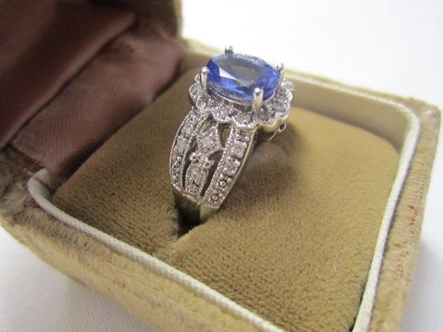 7.2 grams. 24 diamonds approx. 30 points. Approx 2 carat oval Tanzanite. Estimate $800 - $1,200