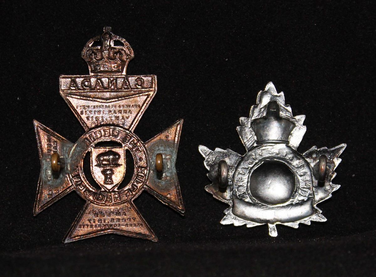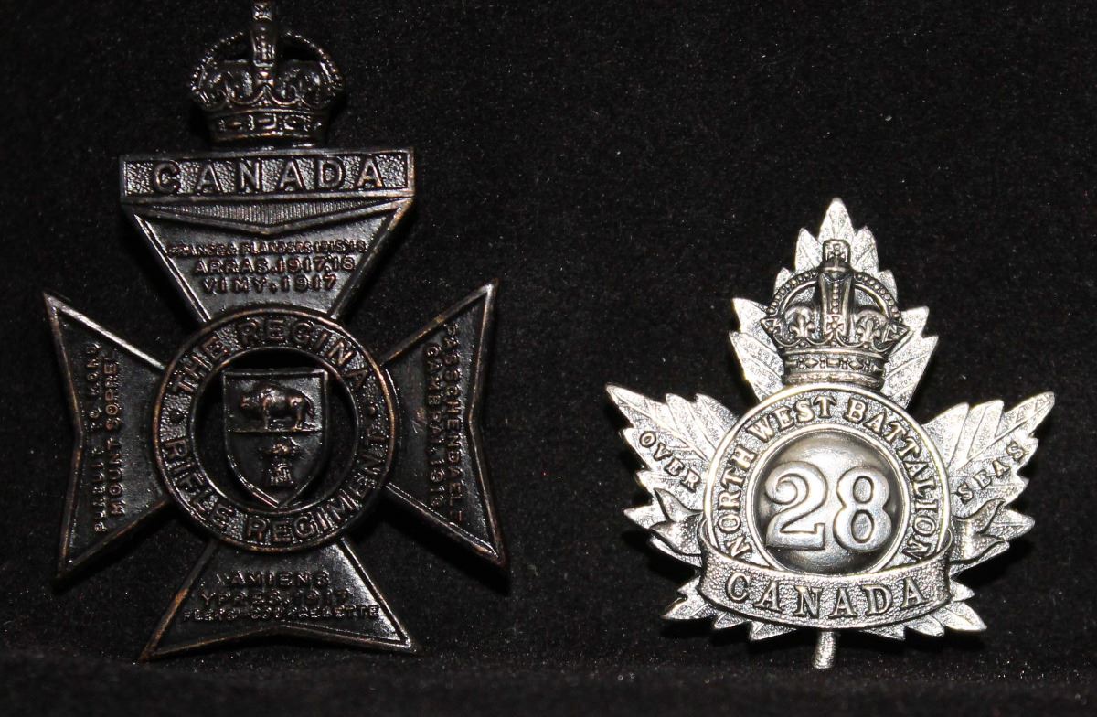 1 - Cap, black coated metal, lug fasteners, nice striking. 1 - Collar, the WW1 28th Battalion badge design, darkened Silver plate, smooth back, worn by OFFICER'S of the Regina Rifles, very nice heavy badge. Lot of 2. Mazeas M142, 1930 issue.
