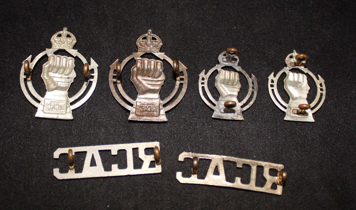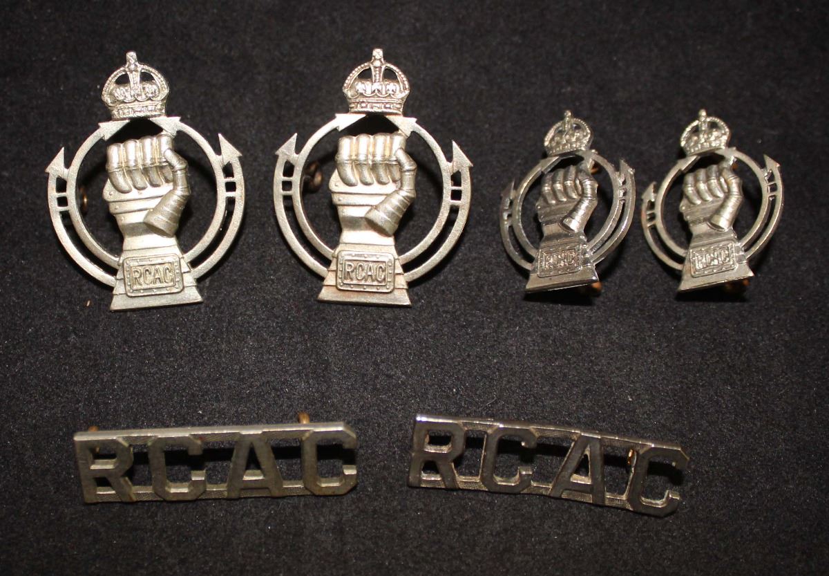 2 - Cap Badges, RCAC banners, Kings Crown, white metal, lug fasteners. 2 - Collar badge, RCAC banners, lug fasteners, white metal. 2 - Titles, RCAC, 2 bar, 11.31mm high, lug fasteners. Mazeas S30. Lot of 6.