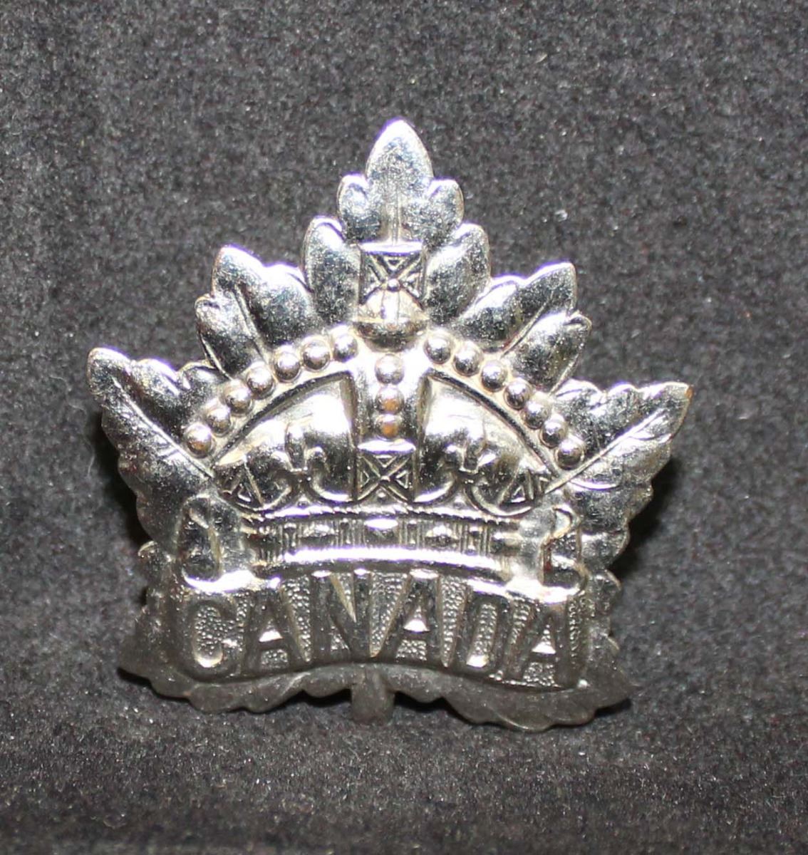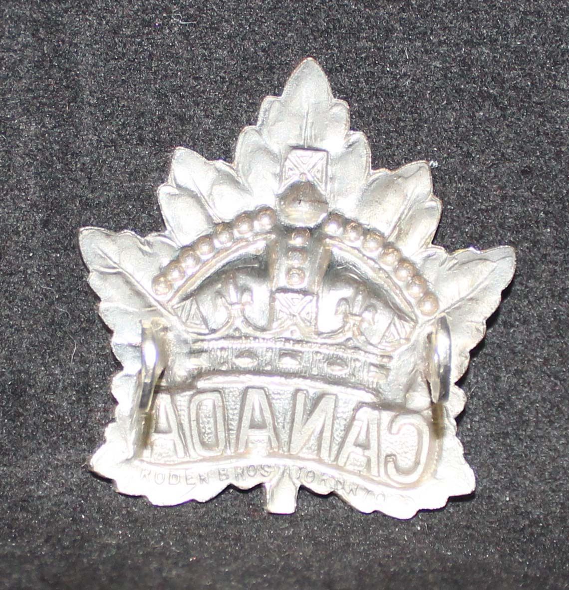 This is a WW1 era General Service Cap badge, silver plated (RODEN BROS TORONTO) flat Ellis type lugs and worn by Officer's attending different university courses during WW2. Usually worn with a white plastic circle disk backing. THOMPSON C57.