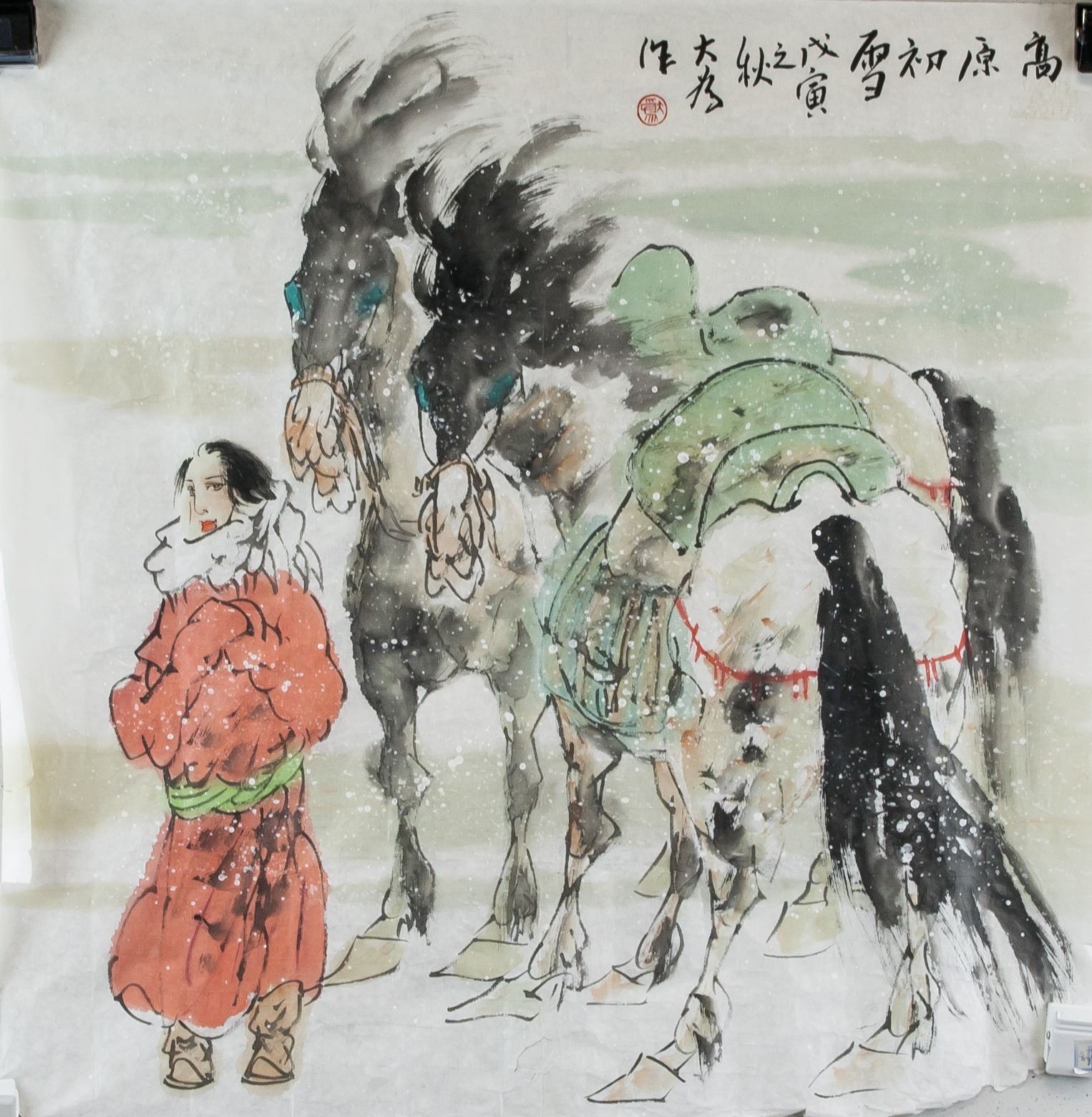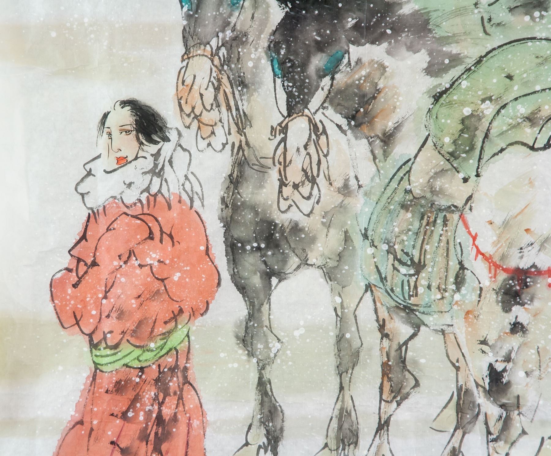 Watercolor on paper, featuring Tibetan girl with horses, signed Da Wei (Chinese, XX), inscribed with 1 artist seal on the upper right corner, 67 x 69 cm