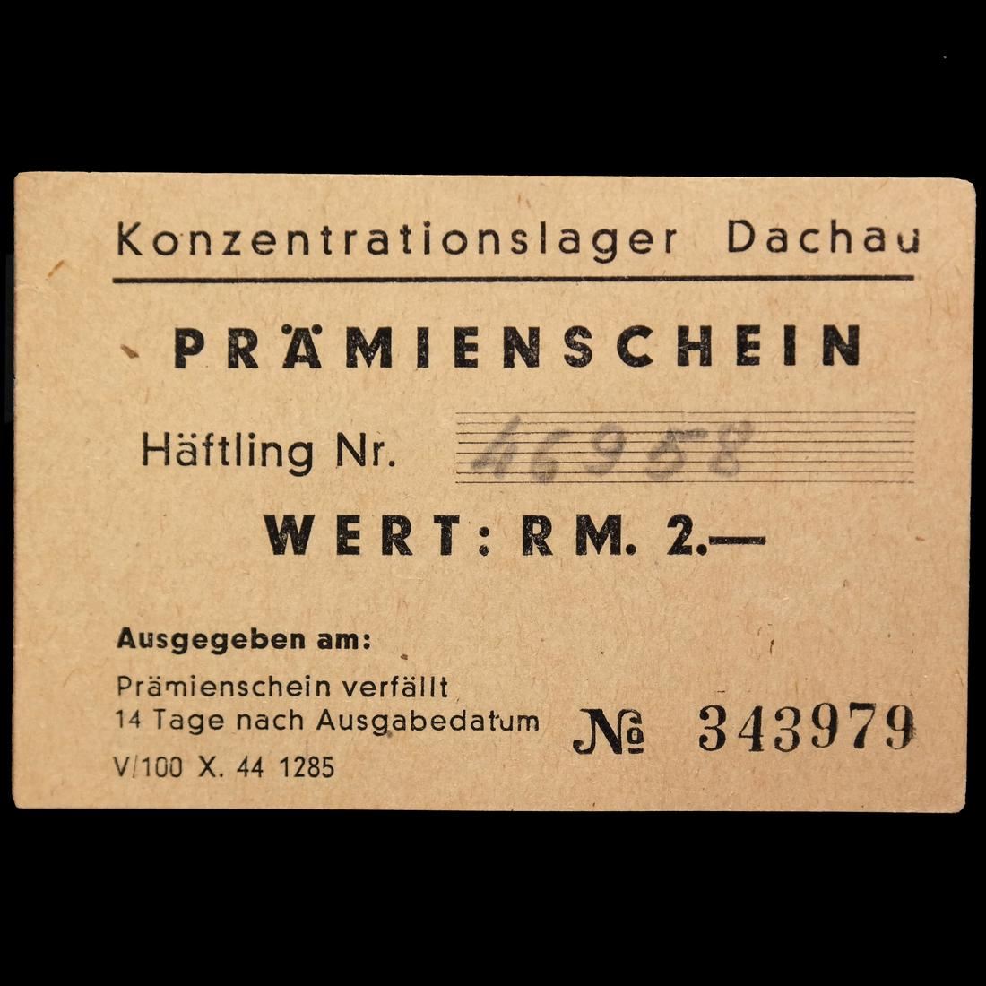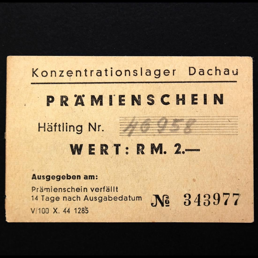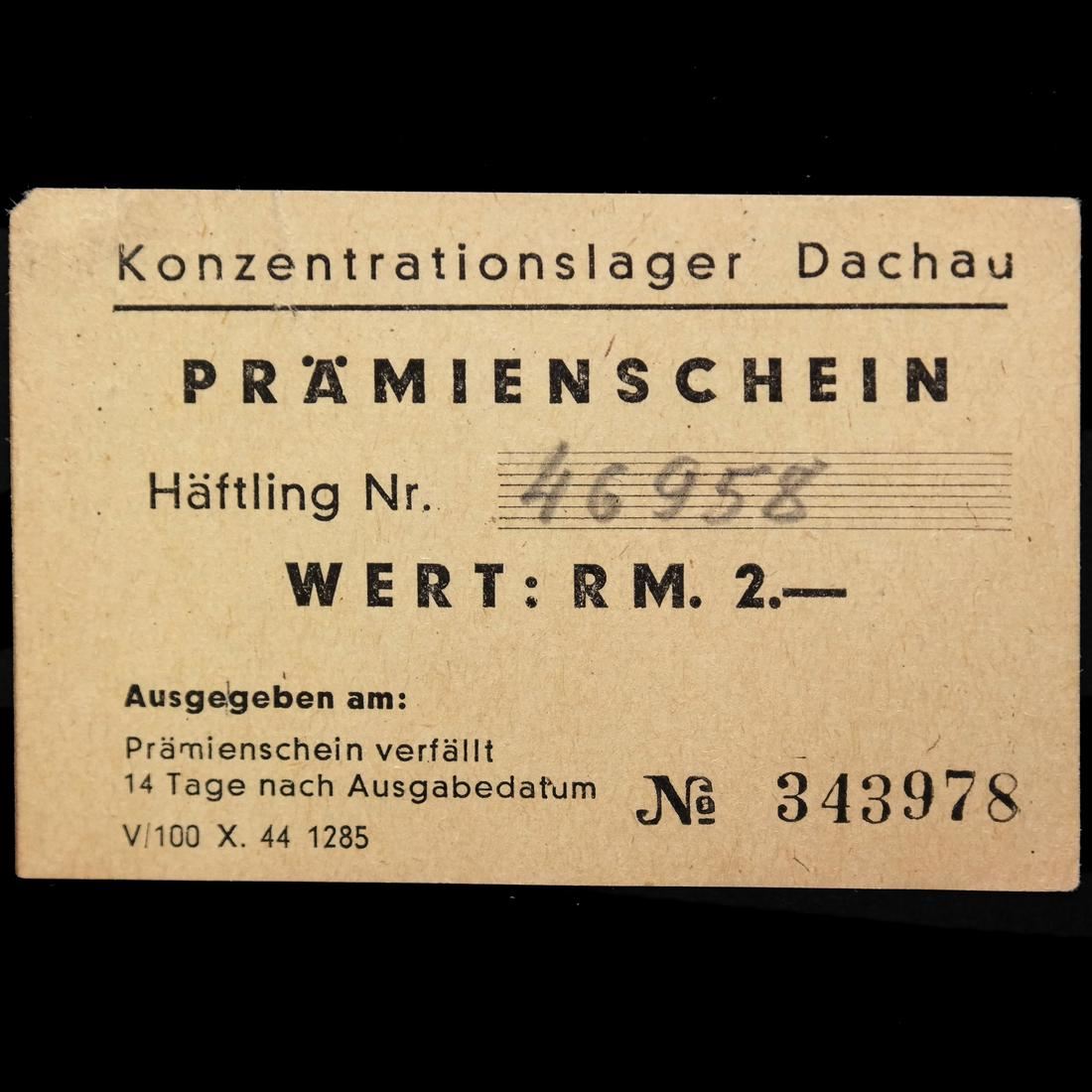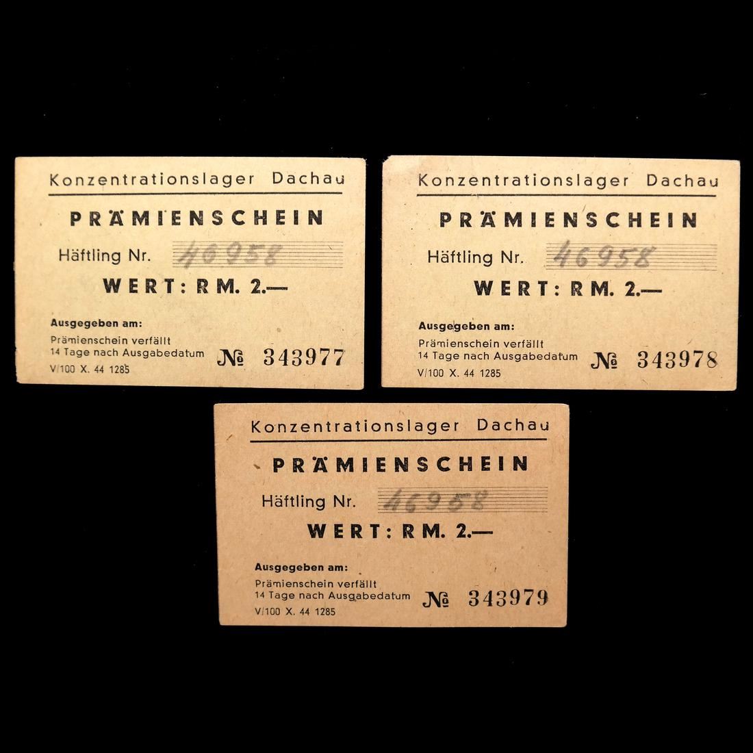 Konzentrationslager Dachau / Prmienschein / Wert: RM. 2.- on cream paper, consecutive serial #343977, 343978 and 343979, prisoner #46958 in pencil on each, each measures approx 75 by 50mm, #343978 has a tiny edge tear and rounded corner, overall VF.