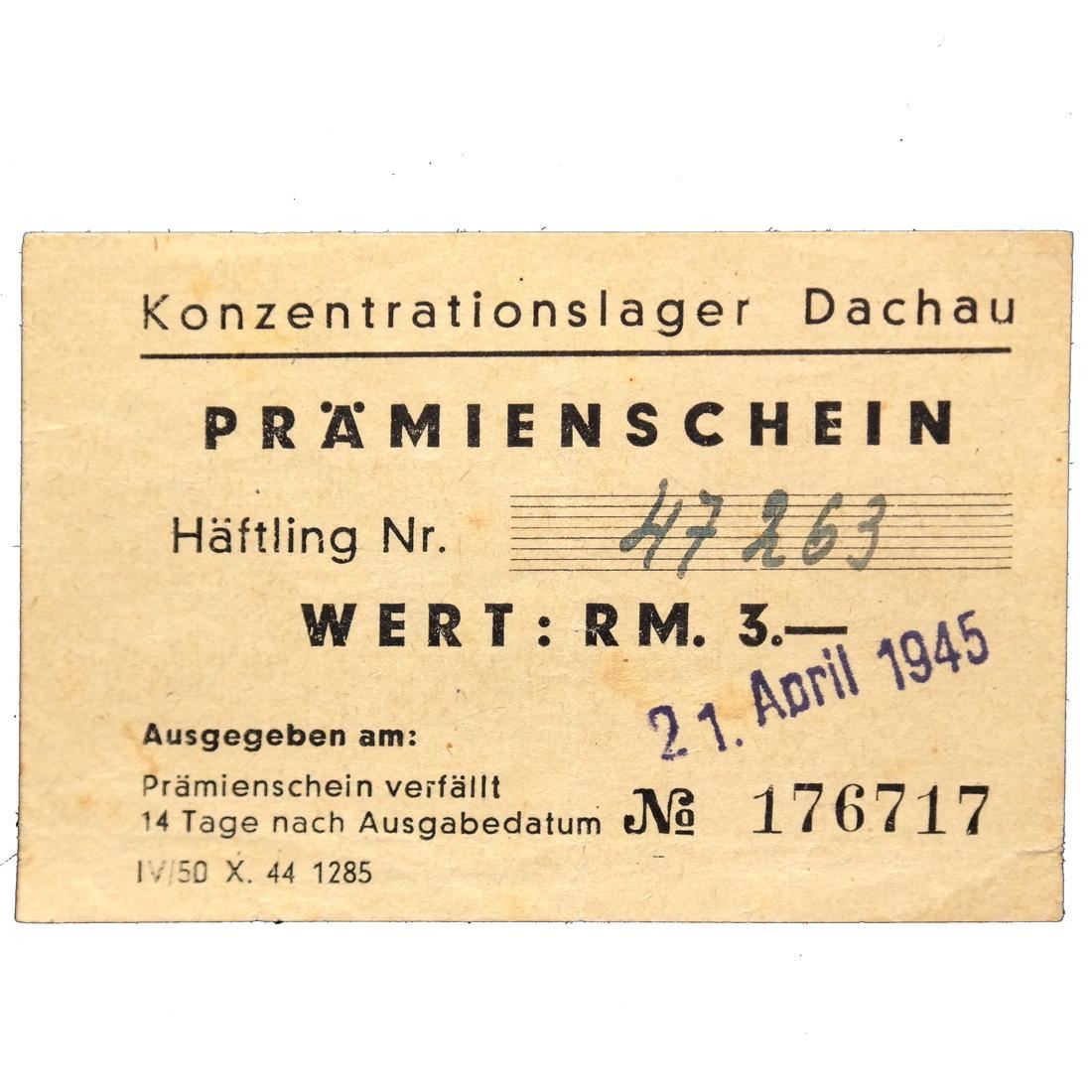 Konzentrationslager Dachau / Prmienschein / Wert: RM. 3.- on cream paper, serial #176717, prisoner #47263 in black ink and bears violet 21.April 1945 date, reverse bears violet SS-Standortherwaltung / Dachau handstamp, measures approx 76 by 51mm, light creases and small edge tears, VF.
