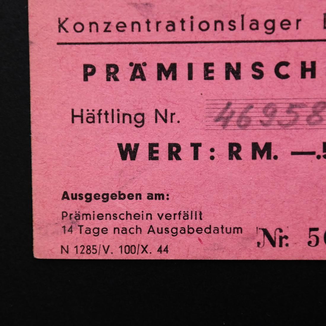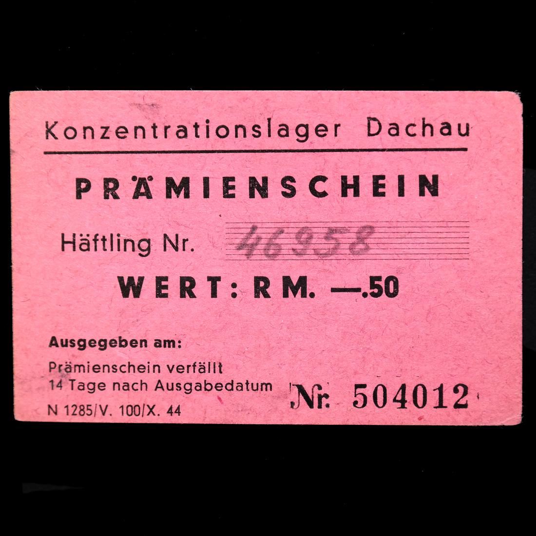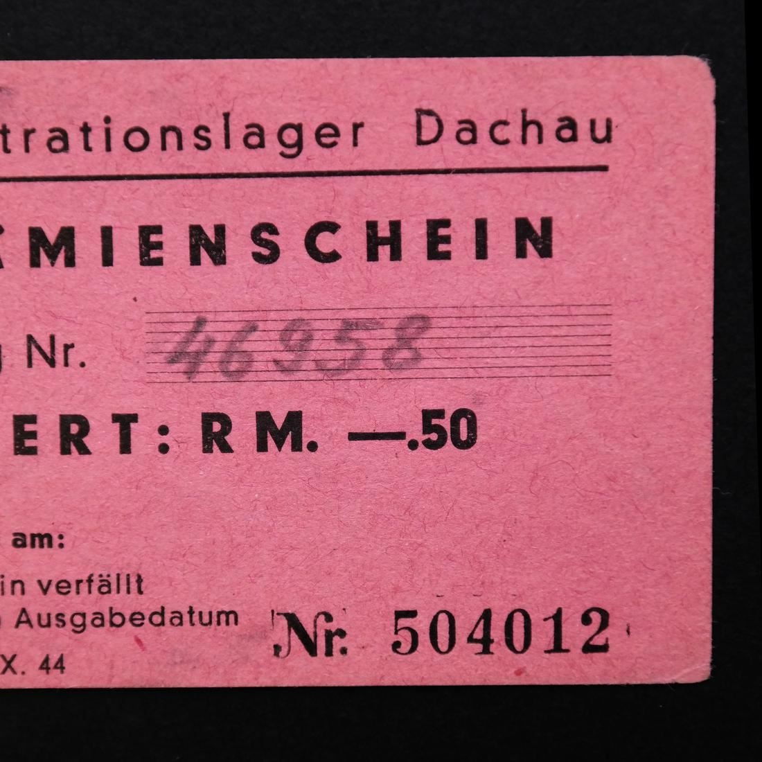 Konzentrationslager Dachau / Prmienschein / Wert: RM -.50 on magenta paper, serial #504012, prisoner #46958 in pencil, measures approx 76 by 49mm, sound and VF.