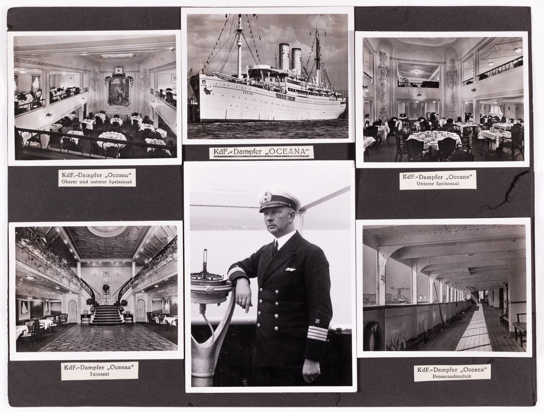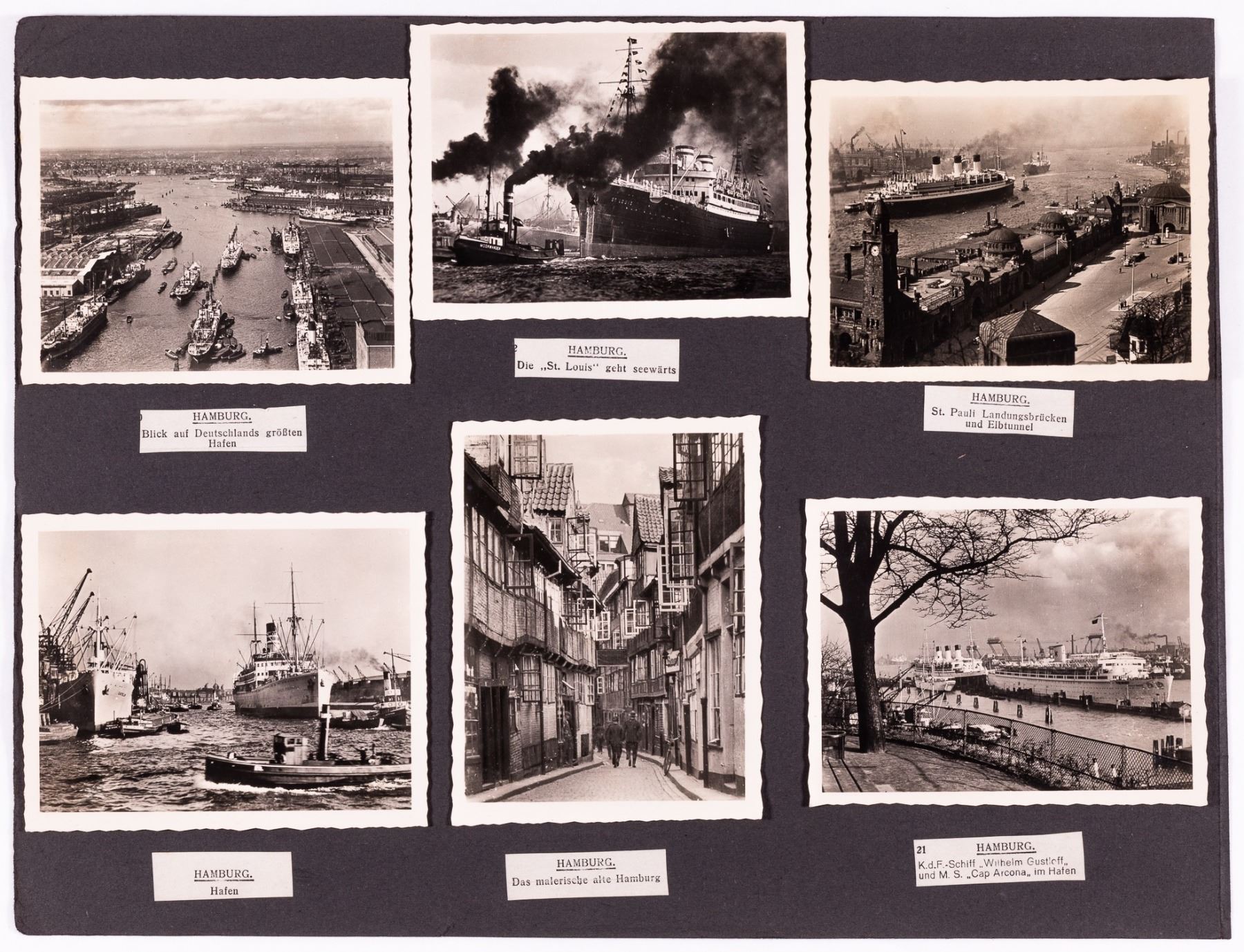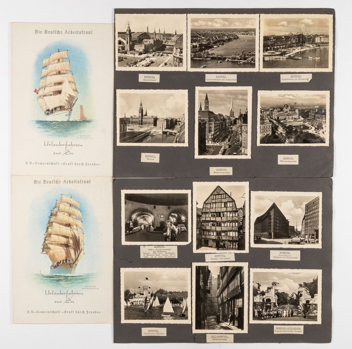Lot of two Deutsche Arbeitsfront DAF Kraft Durch Freude KDF (Joy Through Work) cruise ship menus from February 1939. 7.5 x 5 inches. WITH: 24 b/w period photographs of sea travels on the KDF ships Oceana, Wilhelm Gustloff, and the M.S. 'Cap Arcona' as well as photographs of Hamburg. Photos approx. 3.5 x 2.75 inches.