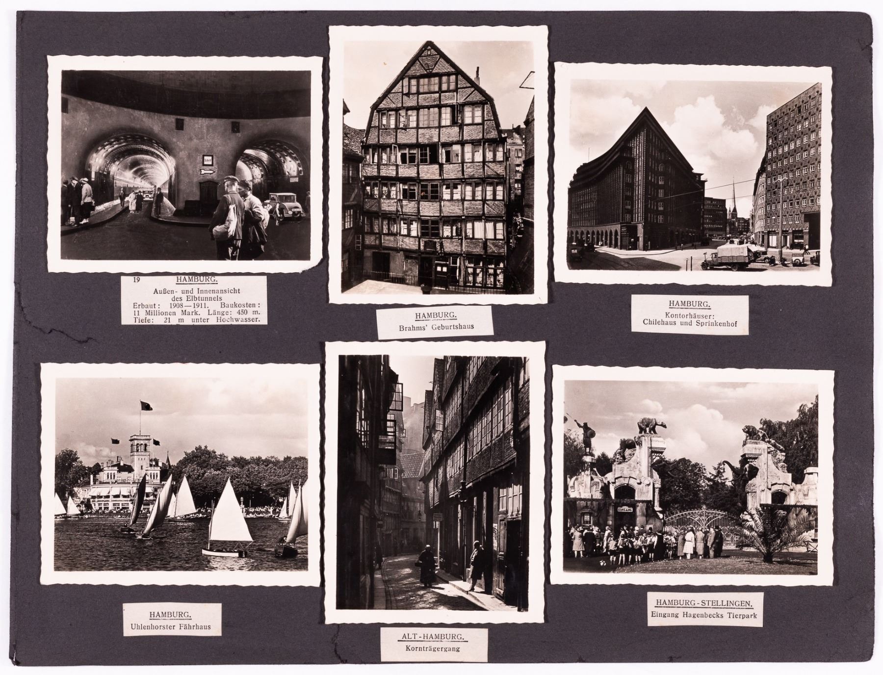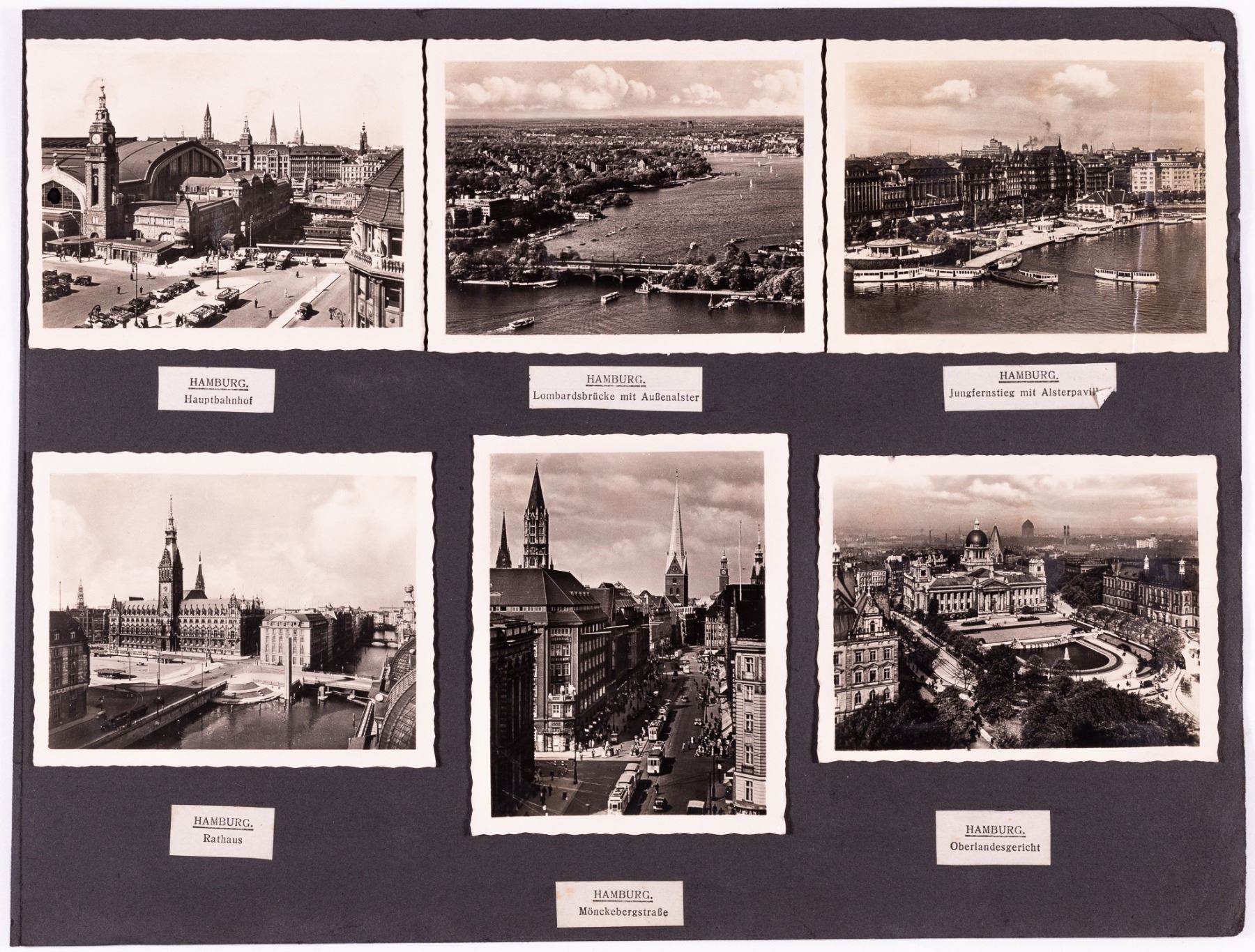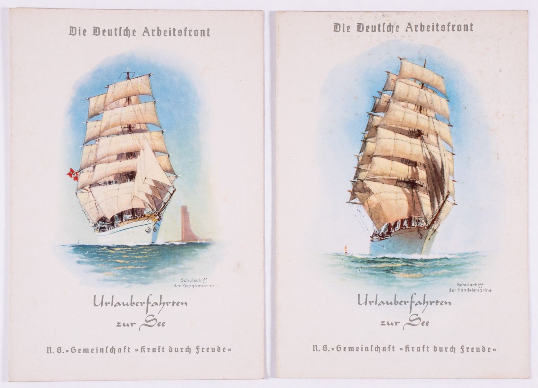 Lot of two Deutsche Arbeitsfront DAF Kraft Durch Freude KDF (Joy Through Work) cruise ship menus from February 1939. 7.5 x 5 inches. WITH: 24 b/w period photographs of sea travels on the KDF ships Oceana, Wilhelm Gustloff, and the M.S. 'Cap Arcona' as well as photographs of Hamburg. Photos approx. 3.5 x 2.75 inches.