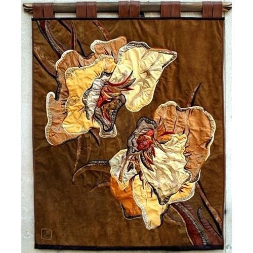 ** DAFFODILS FOR ANGELS ** SILK EMBROIDERED LEATHER, WALL TAPESTRY, ARTIST SIGNED. This stylish Wall Tapestry of exceptional quality, colored and painted genuine leather, silk thread embroidery and with an an upper wood frame -- was hand created in the characteristic style by famous European tapestry artist Hermina Csata. Unique and One of a kind Hermina monogrammed Tapestry! It will be accompanied by a Certificate of Authenticity duly signed by the artist. We guarantee that this is a rare original work of art made by one of the prominent European tapestry artists, combining both innovative fashion and function: the delicate balance of the provocative modernism and the tradition of the manual techniques! The impressive wall tapestry measures 140/110cm or 55.11/43.30 in. Pristime / exquisite new condition! As the owner of a Hermina tapestry artwork, you have acquired an exceptional creation representative for the contemporary home decoration design, certain to become a valued collector's item. -- Art Dealers Welcomed! --