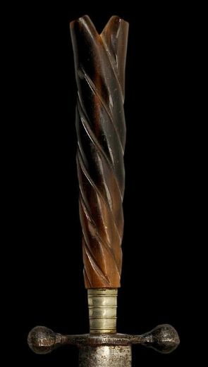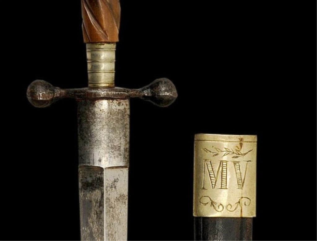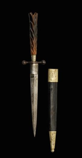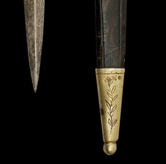 DAGGER Nineteenth Century. Sturdy blade a rhomboid cross-section, guard in iron grip his in bone, complete with scabbard leather two chocks in white metal, laying down monogram inMVin, and bears the inscription: inI REMEMBERin; In excellent condition