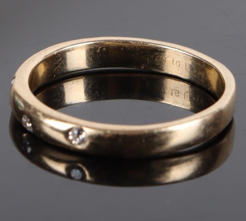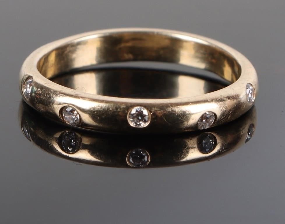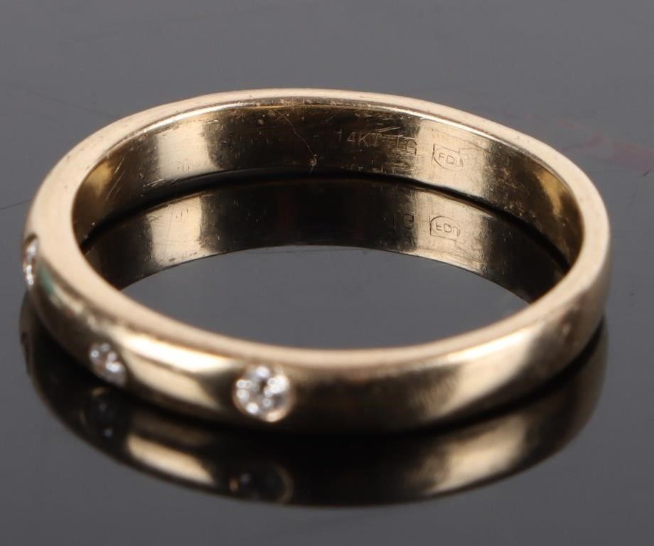 Dainty 14K yellow gold ladies diamond band with five 0.02CT diamonds.
