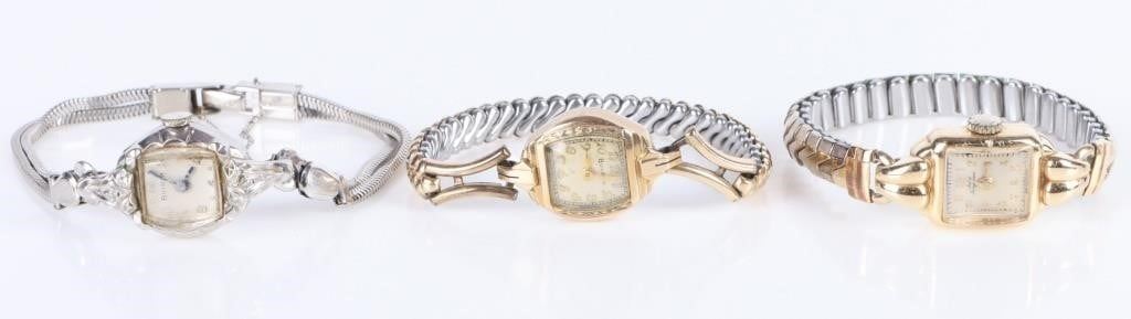 Dainty ladies gold & silver tone wristwatches (3). The watches include a Bulova 10K white gold filled with two diamond chips, Bulova expandable watch & a Jules Jurgensen ladies watch.
