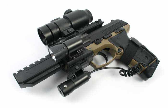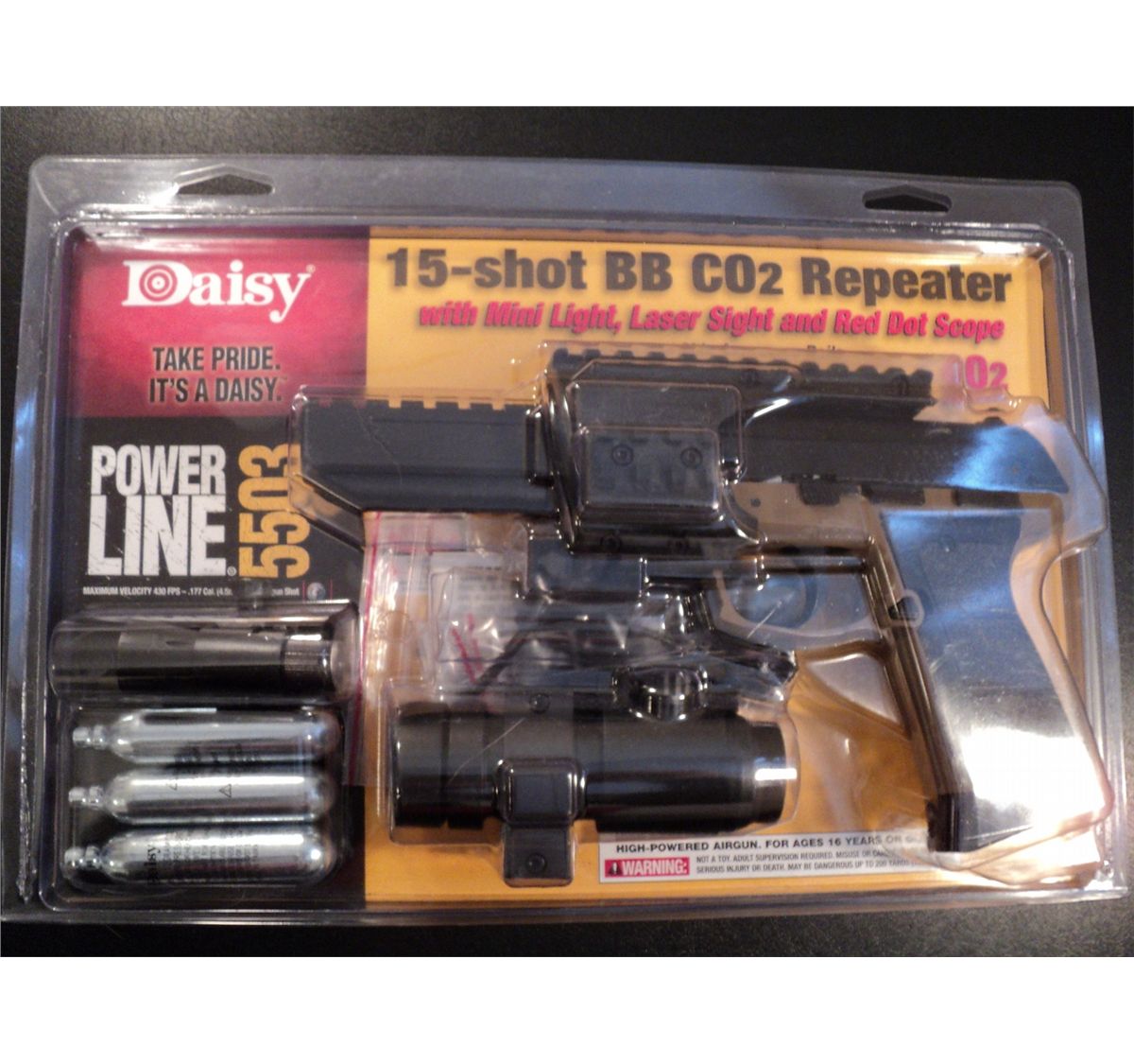 DAISY 15-SHOT CO2 BB REPEATER PISTOL WITH LIGHT, LASER SIGHT AND RED DOT SCOPE