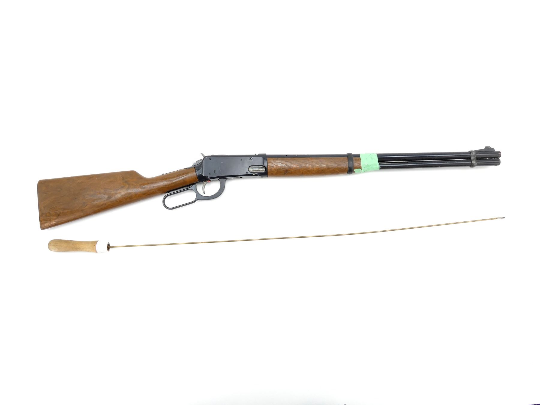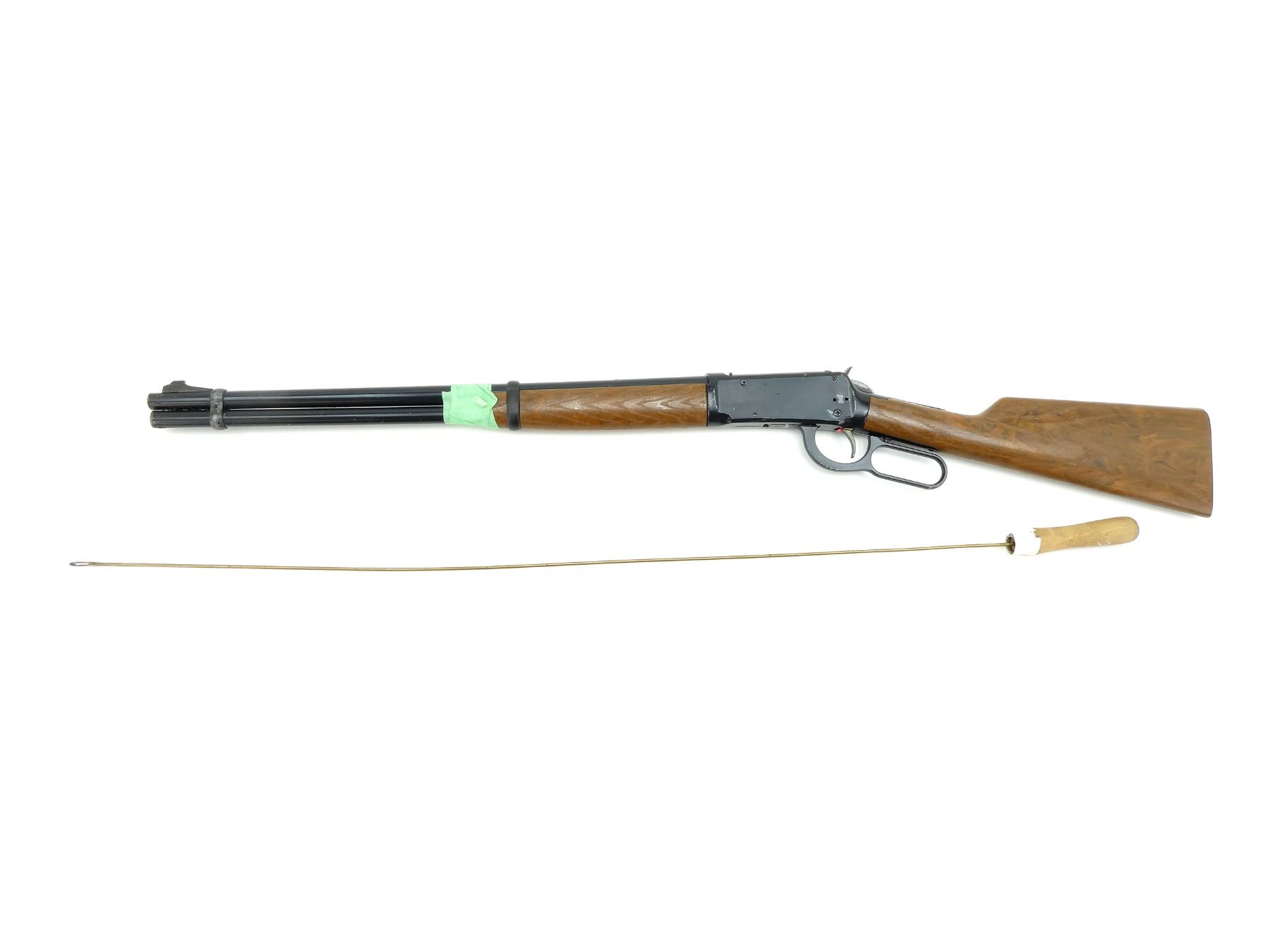 (1) .177 CAL BB, SPRING / AIR POWERED, SINGLE SHOT, LEVER ACTION, STEEL & WOOD CONSTRUCTION, TAPE ON BARREL / FOREND, VARIOUS MARKINGS, NO COCKING ISSUES, NOT FULLY TESTED, CONSIGNOR STATES: "NEEDS REPAIR" & (1) .22 CAL BRASS CLEANING ROD, WOOD HANDLE, OAL APPROX. 37 5/8". SEE PHOTOS.