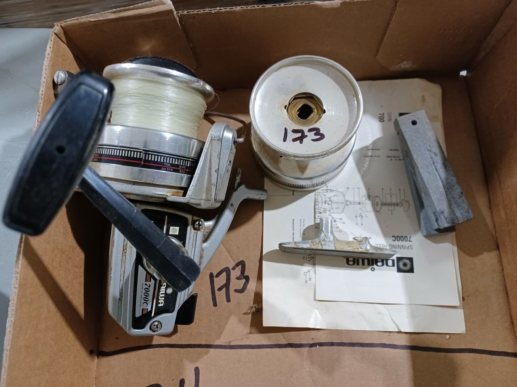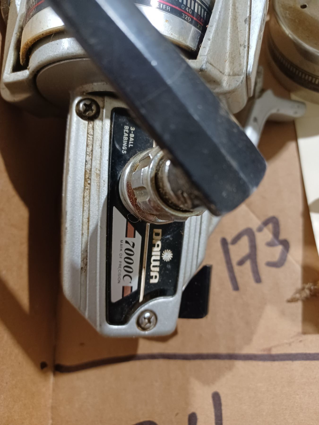 DAIWA 7000C (BROKEN ROD ATTACHEMENT BRCKET) , HOOK SHARPENERS x3, AND SPARE REEL