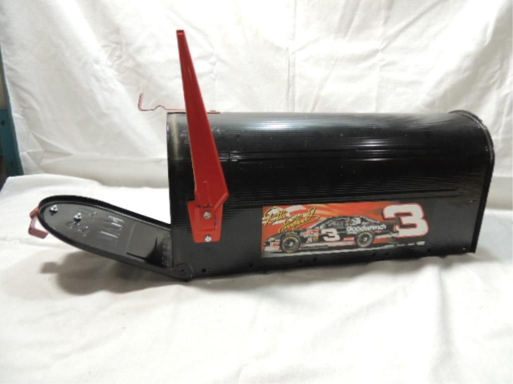 TIN MAILBOX, BLACK AND RED WITH STRAIGHT FLAG AND EARNHARDT #3 DECALS. SEE PHOTOS FOR MORE.