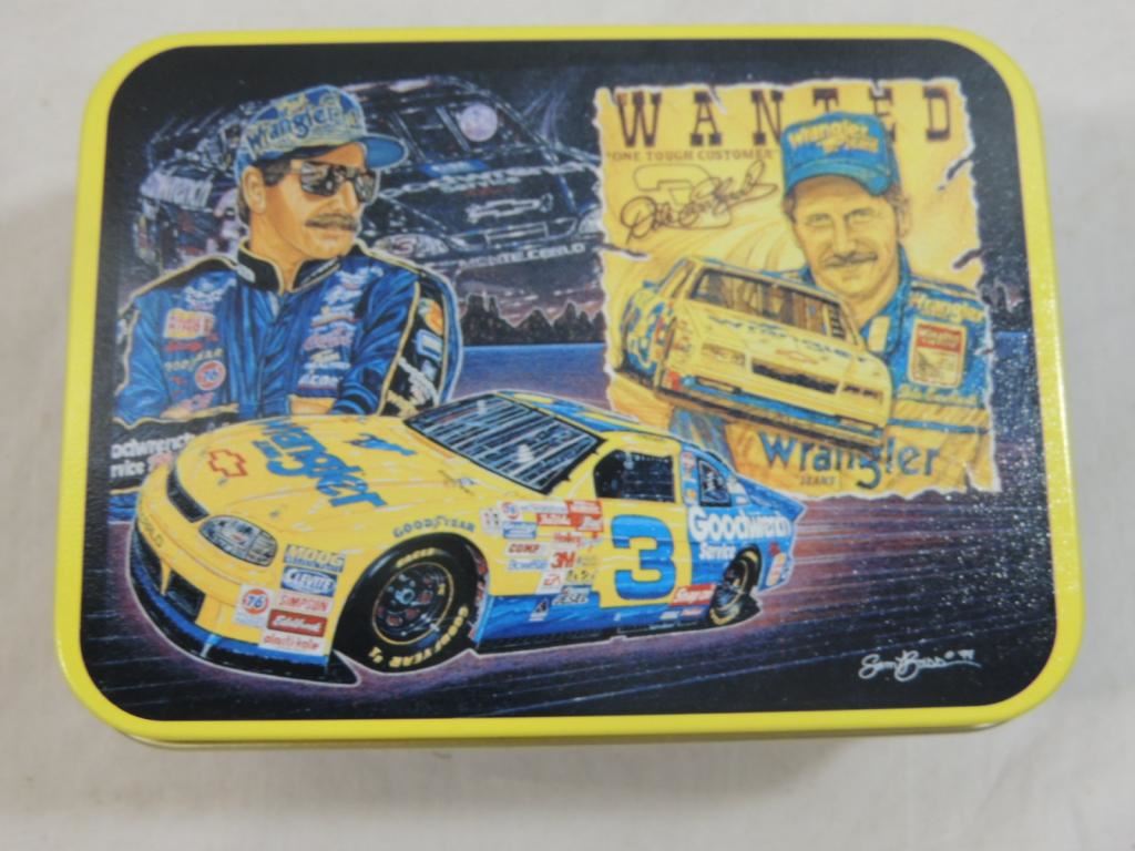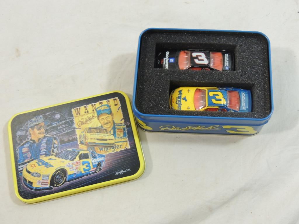 TWO MATCHBOX CARS, DALE EARNHARDT COLLECTORS CARS, COA COLLECTIBLE TIN, WRANGLER, SAM BASS ARTWORK AS SHOWN SEE PHOTO FOR MORE DETAILS.