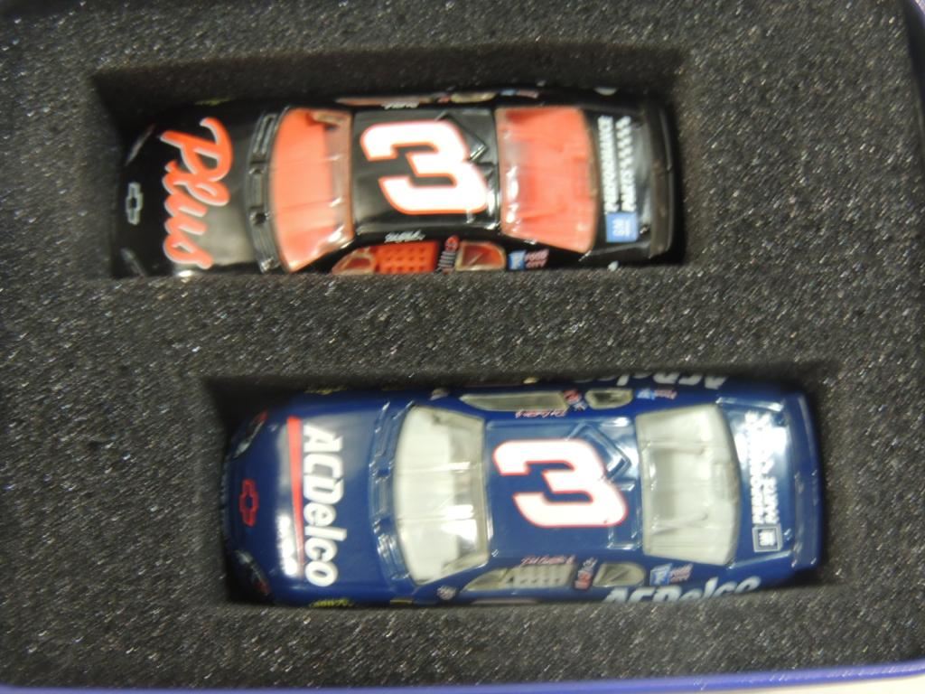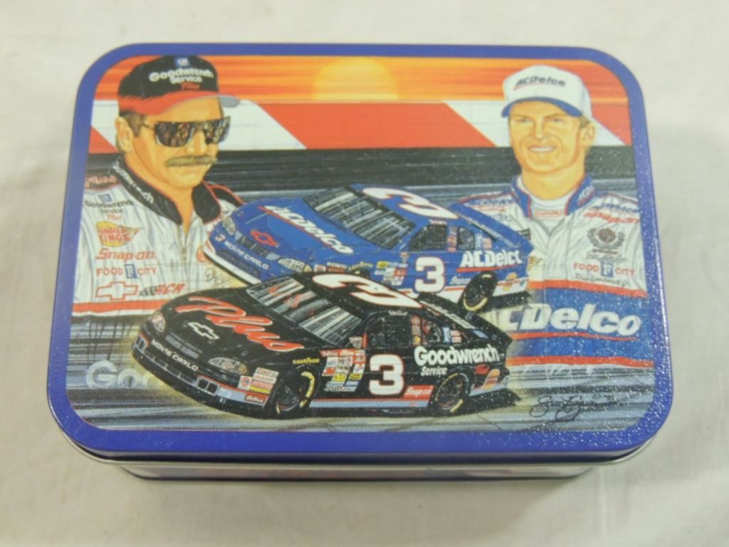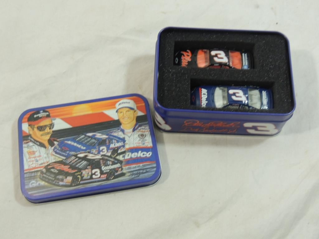 TWO MATCHBOX CARS IN COLLECTORS TIN, DALE EARNHARDT, DALE EARNHARDT JR, COLLECTIBLE TIN, COLLECTORS, NASCAR AS SHOWN SEE PHOTO FOR MORE DETAILS.