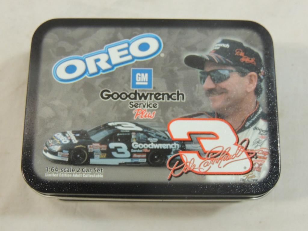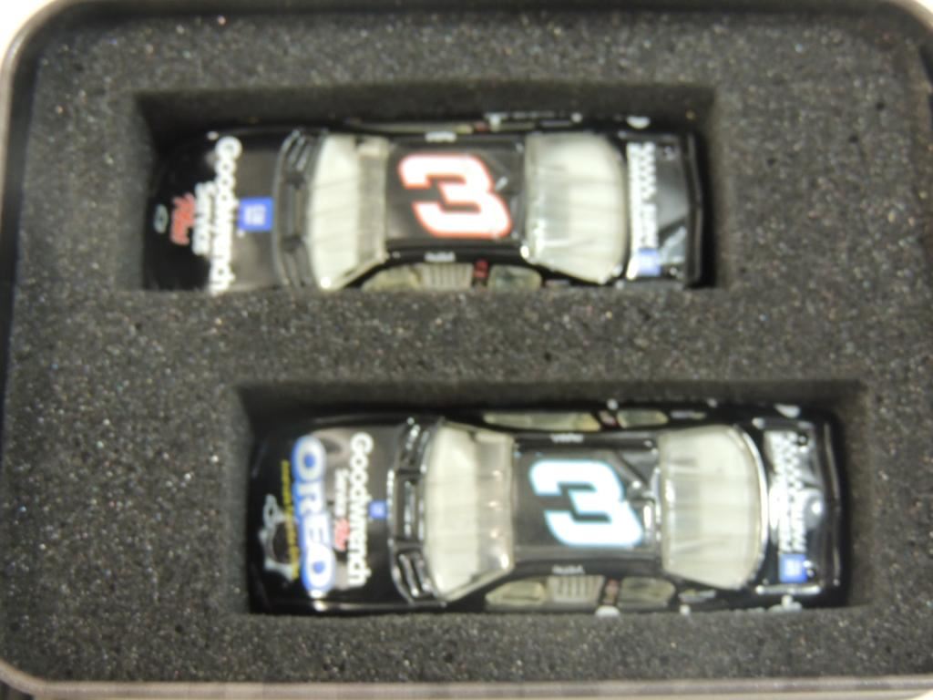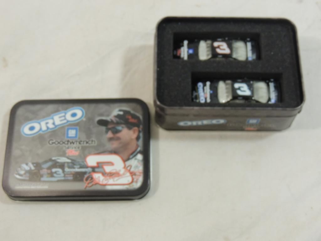 TWO MATCHBOX CARS, COLLECTIBLE TIN, NASCAR TIN, ACTION SERIES, COLLECTORS STOCK CAR REPLICAS, AS SHOWN SEE PHOTO FOR MORE DETAILS.