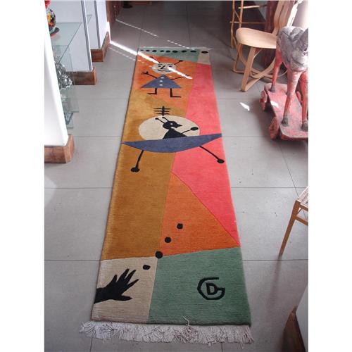 Space Rug: Embossed wool runner. Detailed with a Martian and a flying saucer, and a hand on a multicolored ground. Signed with monogrammed cipher.