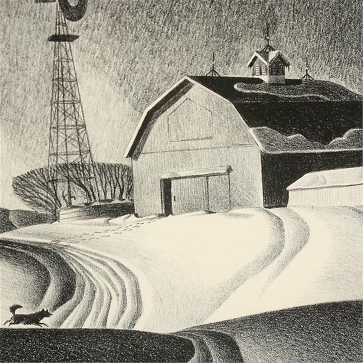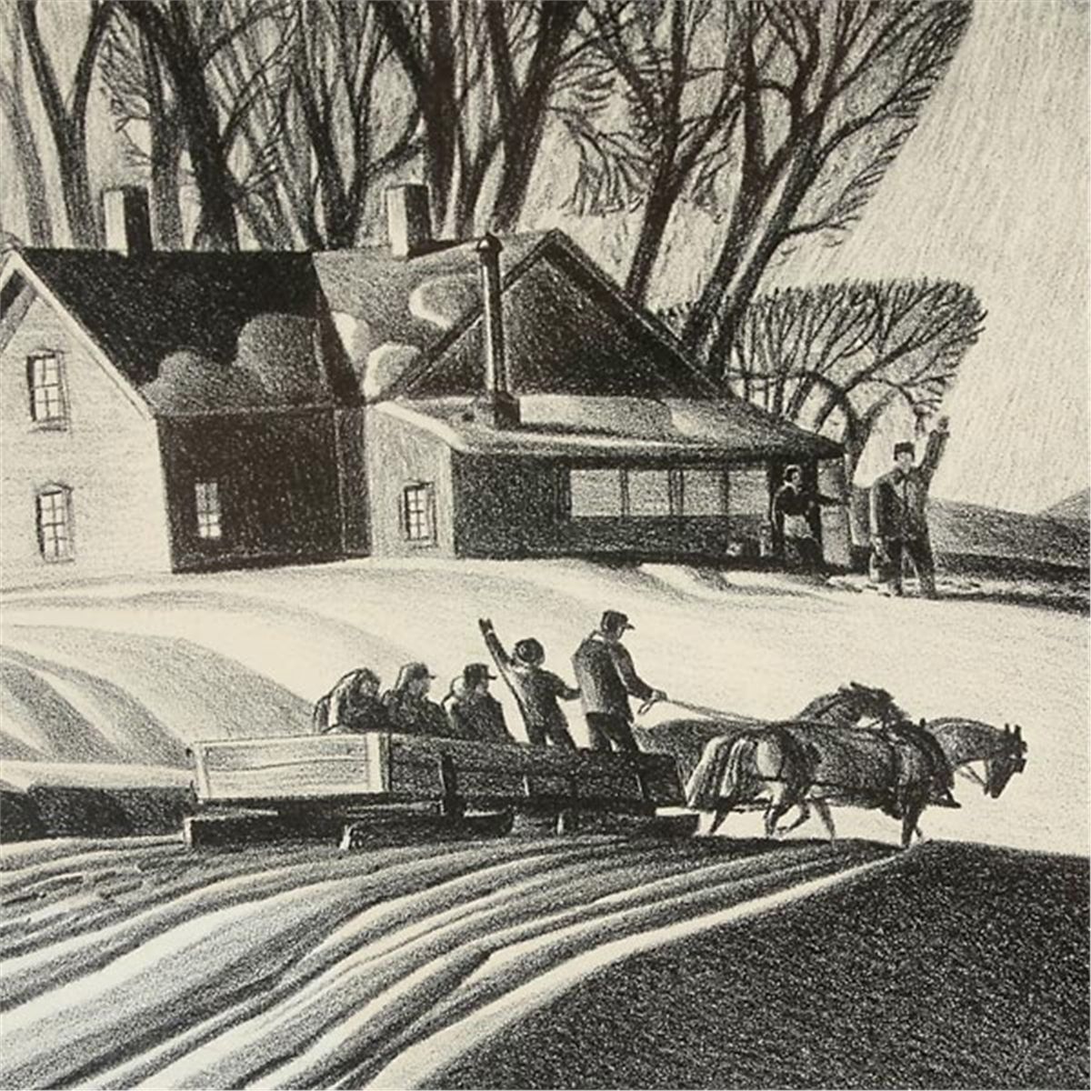 DALE NICHOLS (American 1904-1995) Company for Supper Lithograph on paper Image: 9.50 x 13.50 inches/ 24.1 x 34.3 centimeters Signed lower right "Dale Nichols" Frame: 17 x 21 inches/ 43.2 x 53.3 centimeters In good condition.  Framed