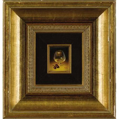 <B>DALHART WINDBERG (b. 1933)</B></I><BR>Untitled Brandy Snifter and Cherries Miniature<BR>Oil on artistboard<BR>1-1/2 x 1-1/4 inches (3.8 x 3.2 cm)<BR>Signed lower right<BR><BR> Remarkable!<BR><BR>Provenance:<BR>Acquired from the artist by the present owner<B>Condition Report:</B> Excellent condition. Period frame in excellent condition.<BR><BR><b>Shipping:</b> Requires 3rd Party Shipping (<a target="_blank" href="http://www.heritageauctions.com/common/shipping.php">view shipping information</a>)