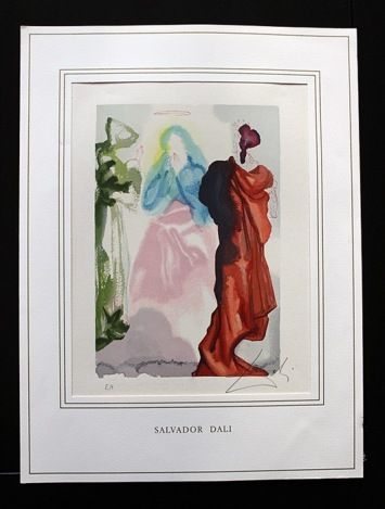 SALVADOR DALI HAND SIGNED COLORED WOOD ENGRAVING - 1960 - CREATED FOR DANTE'S "LA DIVINA COMMEDIA" - ARTIST'S PROOF - HAND SIGNED IN PENCIL BY DALI - NUMBERED IN THE LOWER LEFT CORNER "EA" IN PENCIL - RIVES PAPER - IMAGE 10" X 7" - FRAMED APPX 20"X16" - PROFESSIONALLY FRAMED - This woodcut is made by the process which is called engraving, because engraving tools are used to make a printing block on a polished slice of the trunk or branch of certain trees, cut across the grain. Because of the small size of the slices of wood, it is often necessary to combine several of the pieces to produce the full image. The image is not cut into the block; it is the unwanted portion that is cut away, and the lines to be printed are in relief. Only one color ink could be applied at a time, so each sheet had to go through the press as many times as there were colors. The shading of colors in the images is so subtle and so varied, that it is hard to believe they were made by carved blocks. One can appreciate the amount of precision and work that went into each of these woodcuts.