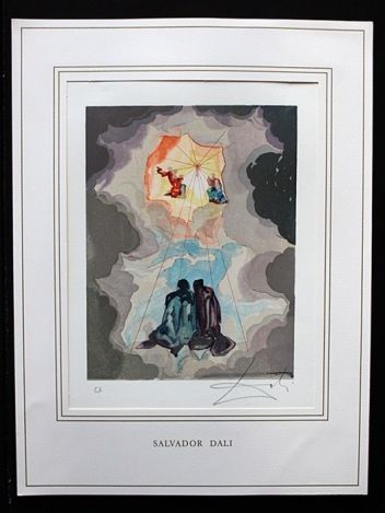 SALVADOR DALI HAND SIGNED COLORED WOOD ENGRAVING - 1960 - CREATED FOR DANTE'S "LA DIVINA COMMEDIA" - ARTIST'S PROOF - HAND SIGNED IN PENCIL BY DALI - NUMBERED IN THE LOWER LEFT CORNER "EA" IN PENCIL - RIVES PAPER - IMAGE 10" X 7" - FRAMED APPX 20"X16" - PROFESSIONALLY FRAMED - This woodcut is made by the process which is called engraving, because engraving tools are used to make a printing block on a polished slice of the trunk or branch of certain trees, cut across the grain. Because of the small size of the slices of wood, it is often necessary to combine several of the pieces to produce the full image. The image is not cut into the block; it is the unwanted portion that is cut away, and the lines to be printed are in relief. Only one color ink could be applied at a time, so each sheet had to go through the press as many times as there were colors. The shading of colors in the images is so subtle and so varied, that it is hard to believe they were made by carved blocks. One can appreciate the amount of precision and work that went into each of these woodcuts.