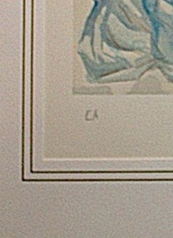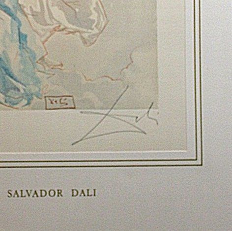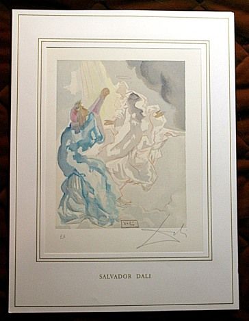 SALVADOR DALI HAND SIGNED COLORED WOOD ENGRAVING - 1960 - CREATED FOR DANTE'S "LA DIVINA COMMEDIA" - ARTIST'S PROOF - HAND SIGNED IN PENCIL BY DALI - NUMBERED IN THE LOWER LEFT CORNER "EA" IN PENCIL - RIVES PAPER - IMAGE 10" X 7" - FRAMED APPX 20"X16" - PROFESSIONALLY FRAMED - This woodcut is made by the process which is called engraving, because engraving tools are used to make a printing block on a polished slice of the trunk or branch of certain trees, cut across the grain. Because of the small size of the slices of wood, it is often necessary to combine several of the pieces to produce the full image. The image is not cut into the block; it is the unwanted portion that is cut away, and the lines to be printed are in relief. Only one color ink could be applied at a time, so each sheet had to go through the press as many times as there were colors. The shading of colors in the images is so subtle and so varied, that it is hard to believe they were made by carved blocks. One can appreciate the amount of precision and work that went into each of these woodcuts.
