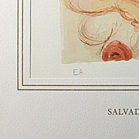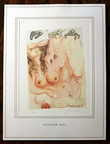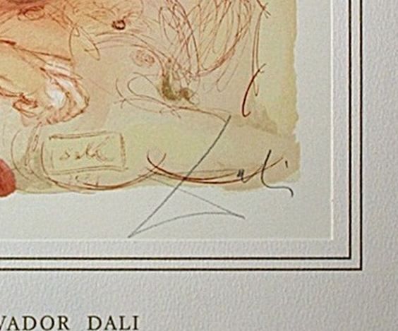 SALVADOR DALI HAND SIGNED COLORED WOOD ENGRAVING - 1960 - CREATED FOR DANTE'S "LA DIVINA COMMEDIA" - ARTIST'S PROOF - HAND SIGNED IN PENCIL BY DALI - NUMBERED IN THE LOWER LEFT CORNER "EA" IN PENCIL - RIVES PAPER - IMAGE 10" X 7" - FRAMED APPX 20"X16" - PROFESSIONALLY FRAMED - This woodcut is made by the process which is called engraving, because engraving tools are used to make a printing block on a polished slice of the trunk or branch of certain trees, cut across the grain. Because of the small size of the slices of wood, it is often necessary to combine several of the pieces to produce the full image. The image is not cut into the block; it is the unwanted portion that is cut away, and the lines to be printed are in relief. Only one color ink could be applied at a time, so each sheet had to go through the press as many times as there were colors. The shading of colors in the images is so subtle and so varied, that it is hard to believe they were made by carved blocks. One can appreciate the amount of precision and work that went into each of these woodcuts.