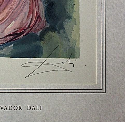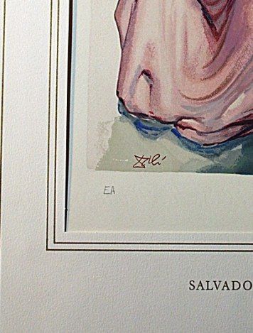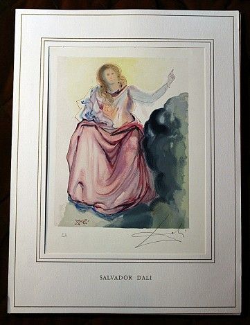 SALVADOR DALI HAND SIGNED COLORED WOOD ENGRAVING - 1960 - CREATED FOR DANTE'S "LA DIVINA COMMEDIA" - ARTIST'S PROOF - HAND SIGNED IN PENCIL BY DALI - NUMBERED IN THE LOWER LEFT CORNER "EA" IN PENCIL - RIVES PAPER - IMAGE 10" X 7" - FRAMED APPX 20"X16" - PROFESSIONALLY FRAMED - This woodcut is made by the process which is called engraving, because engraving tools are used to make a printing block on a polished slice of the trunk or branch of certain trees, cut across the grain. Because of the small size of the slices of wood, it is often necessary to combine several of the pieces to produce the full image. The image is not cut into the block; it is the unwanted portion that is cut away, and the lines to be printed are in relief. Only one color ink could be applied at a time, so each sheet had to go through the press as many times as there were colors. The shading of colors in the images is so subtle and so varied, that it is hard to believe they were made by carved blocks. One can appreciate the amount of precision and work that went into each of these woodcuts.