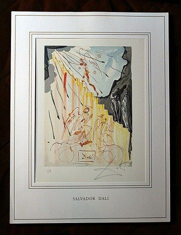 SALVADOR DALI HAND SIGNED COLORED WOOD ENGRAVING - 1960 - CREATED FOR DANTE'S "LA DIVINA COMMEDIA" - ARTIST'S PROOF - HAND SIGNED IN PENCIL BY DALI - NUMBERED IN THE LOWER LEFT CORNER "EA" IN PENCIL - RIVES PAPER - IMAGE 10" X 7" - FRAMED APPX 20"X16" - PROFESSIONALLY FRAMED - This woodcut is made by the process which is called engraving, because engraving tools are used to make a printing block on a polished slice of the trunk or branch of certain trees, cut across the grain. Because of the small size of the slices of wood, it is often necessary to combine several of the pieces to produce the full image. The image is not cut into the block; it is the unwanted portion that is cut away, and the lines to be printed are in relief. Only one color ink could be applied at a time, so each sheet had to go through the press as many times as there were colors. The shading of colors in the images is so subtle and so varied, that it is hard to believe they were made by carved blocks. One can appreciate the amount of precision and work that went into each of these woodcuts.