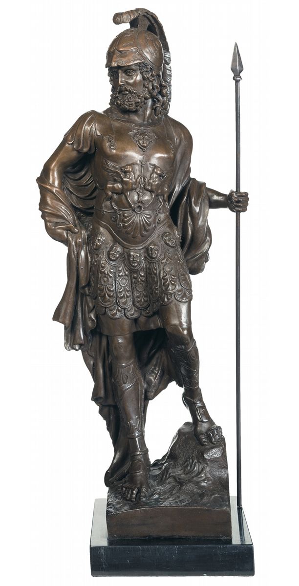 This bronze shows Alexander the Great (356-323 C.C.); King of Macedonia, Conqueror of the Greek city states and of the Persian Empire from Asia Minor to Egypt. He is dressed in full military attire with a spear in his left hand. He is standing upright as he looks forward to his next conquest. Signed "DALOV" on the front of the base. Mounted on a black marble plinth. Stands 27 inches tall and weighs 33 pounds.
