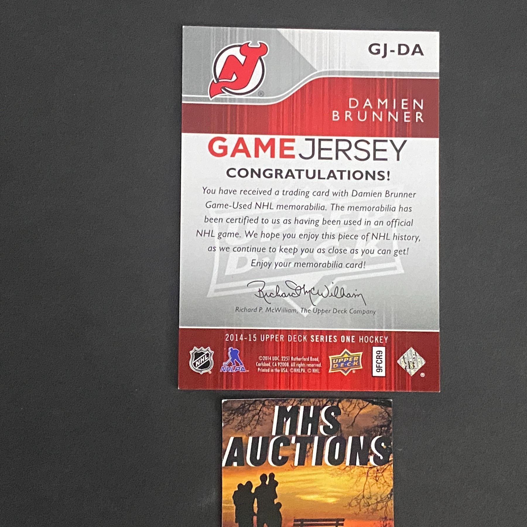 DAMIEN BRUNNER 2014-15 UPPER DECK SERIES 1 DEVILS JERSEY CARD
