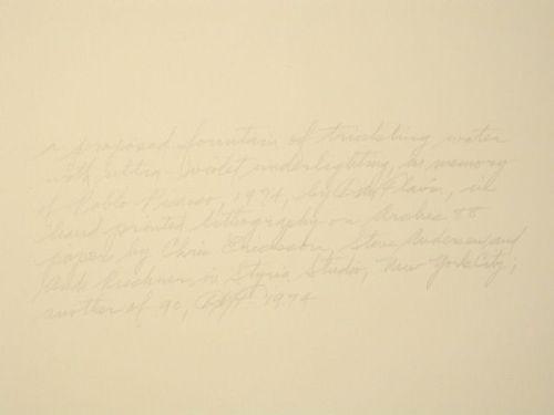 The work is extensively commented, signed and dated in pencil by the artist on the reverse: "a proposed fountain of trickling water with ultra violet underlighting, in memory of Pablo Picasso, 1974, by Dan Flavin, in hand-printed lithography on Arches 88 paper by Chris Erichson....".