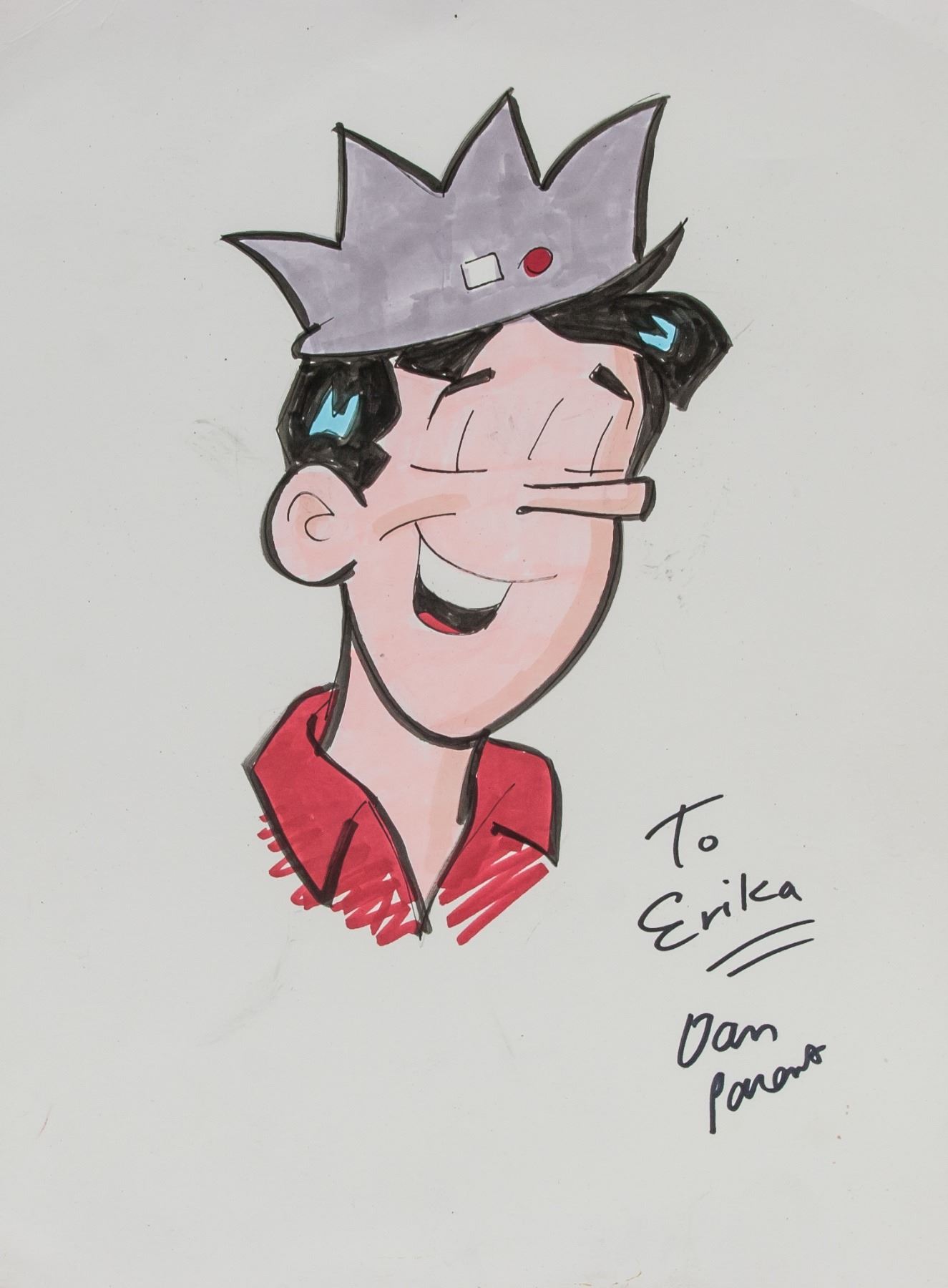 Ink and marker on paper, featuring comic of Jughead Jones, signed and attr. Dan Parent (American, b.1964) on the lower right corner, with dedication to Erica, 9 x 12 in. (22.9 x 30.5 cm), Dan Parent is an American comic book artist and writer, best known for his work for Archie Comics. A graduate of The Kubert School, Parent began working for Archie immediately after graduation. His writing of the Love Showdown series from 1994 received widespread attention. Parent has also illustrated Felix the Cat, Barbie, Disney Adventures, and a wide variety of other titles.