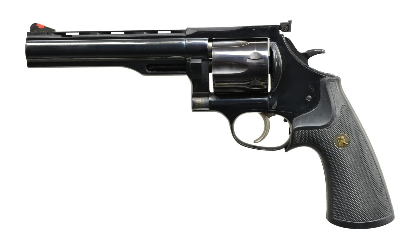 ADDITIONAL BARRELS, SCOPE & GRIPS. Cal. 44 Mag. S# 003193. Heavy blued frame w/ adj. rear sight has interchangeable bbls.(6" presently fitted). 8" Bbl. holds Tasco EER 1.5x20 scope w/ dot reticle. Frame has Pachmayr rubber grips. UNATTACHED ACCESSORIES: This pistol comes w/ 6", 8" & 10" bbls. all w/ vent ribs, spare 8" bbl insert. Checkered, uncheckered & finger groove grips are included; all in plastic case which also contains bbl. removal tool & belt buckle. CONDITION: fine. Showing little use, has bolt drag mark on cyl. Mechanically good. (21-1198/ MGM). MODERN. $700-1,000.