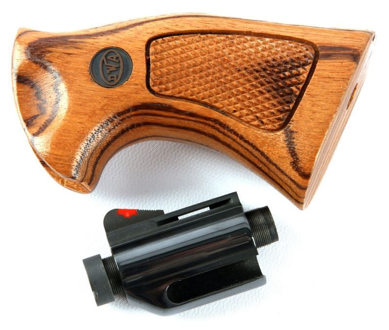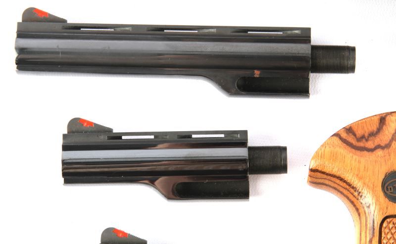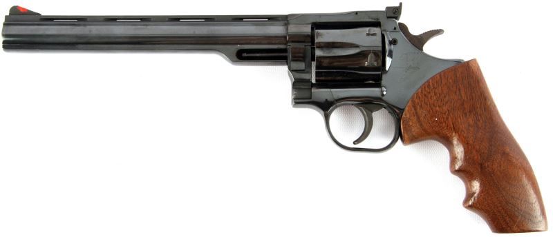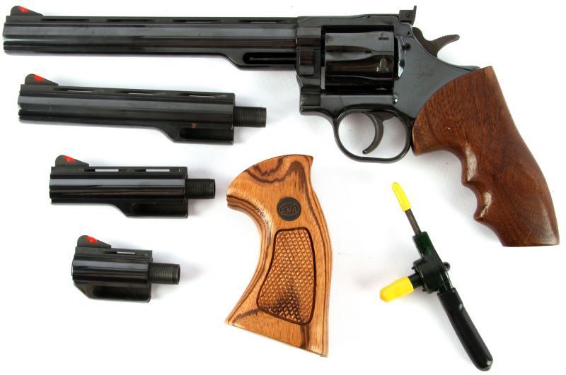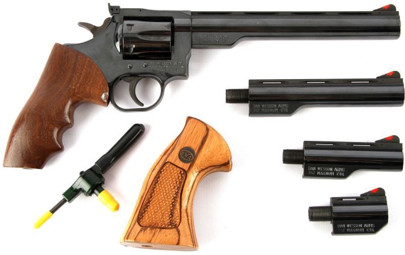 Dan Wesson Model 15-2 blued .357 Magnum target revolver in "Pistol Pack" with three additional interchangeable barrels measuring 3, 4 and 6 inches, and 8 inch barrel currently affixed to gun. Also included is barrel wrench, gauge, additional sights, and additional grips. All bores are bright and clean, bluing on gun and barrels is 98%, and both sets of grips excellent. Overall excellent condition. Caliber: .357 Magnum Serial #: 192602