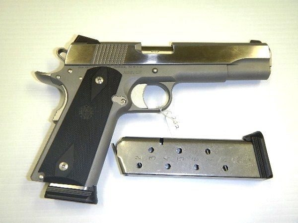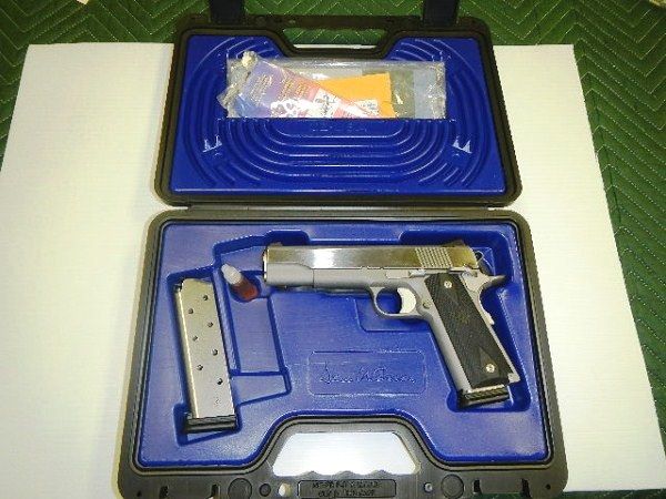 SEMI AUTOMATIC PISTOL, CAL: 45ACP, SN: H881CZ, 5" MATCH BARREL, BRUSHED STAINLESS STEEL, HOGUE GRIPS, TRIJICON FRONT SIGHT, 2 - 8 ROUND MAGAZINES, HARD CASE