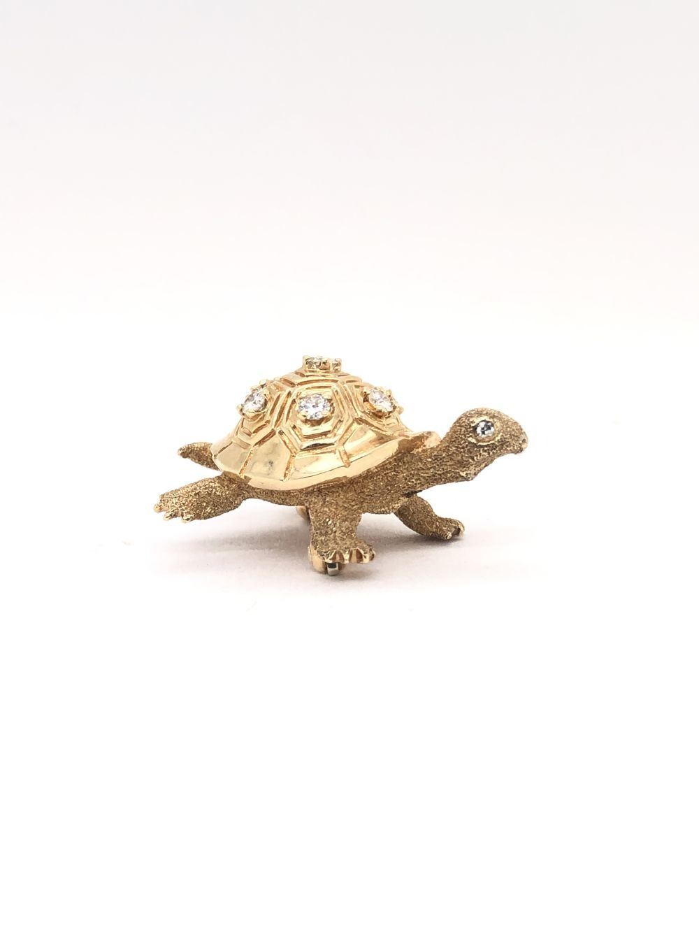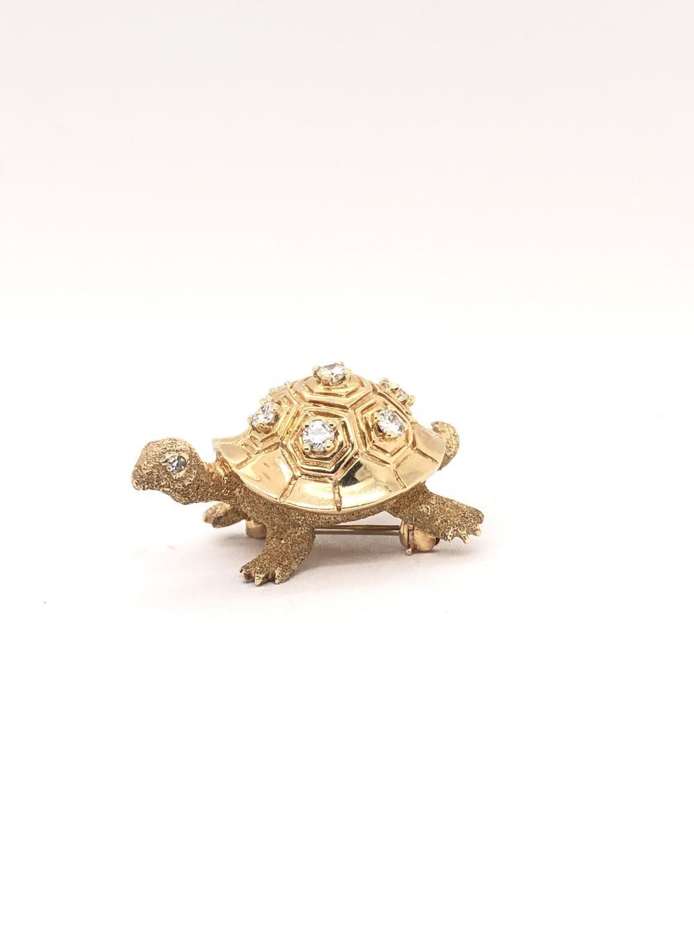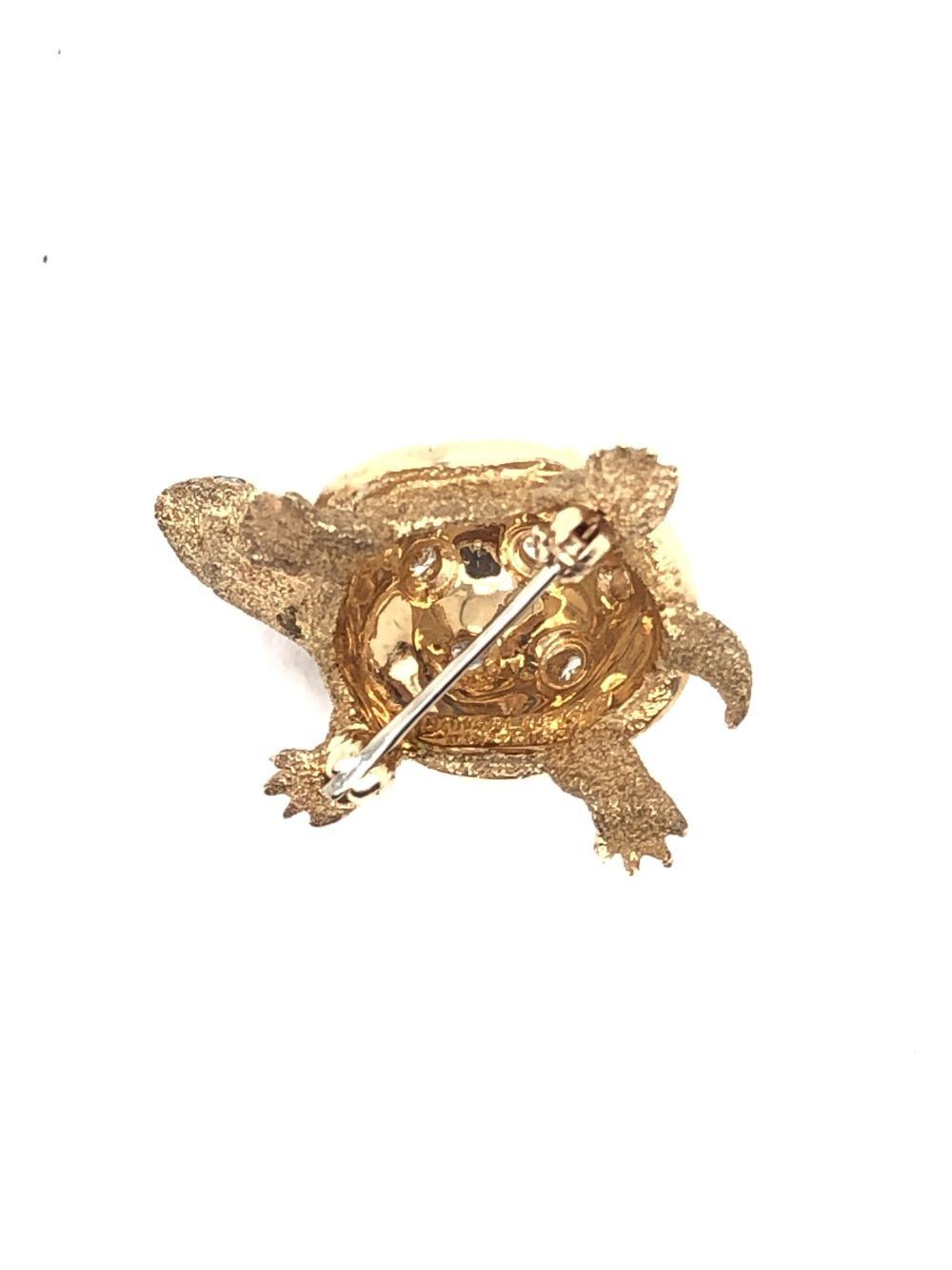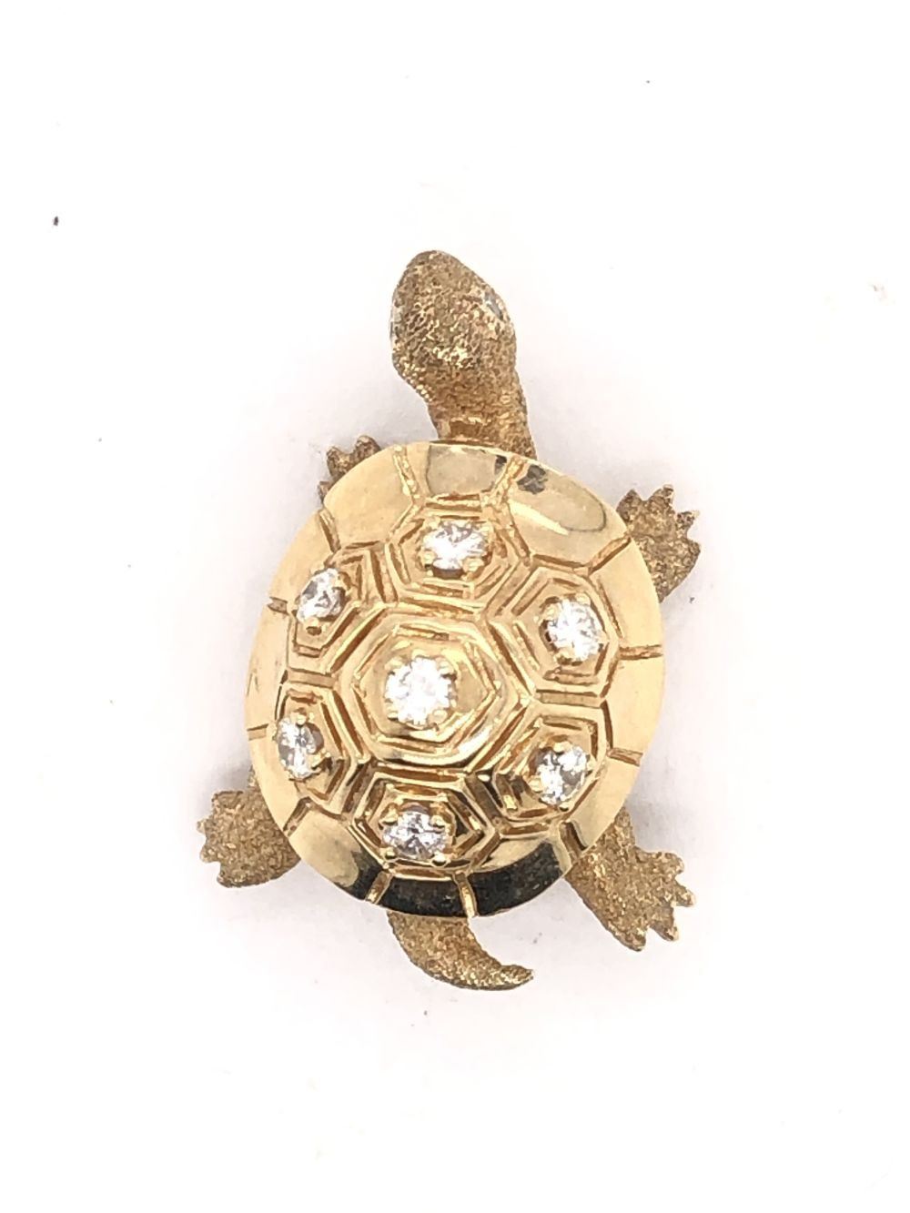 Earth-Mined Diamond Brooch.& nbsp; You can't help but love this turtle brooch!& nbsp; Cast from 14 karat yellow gold, this circa early1970's, three dimensional brooch is not just beautiful, but an excellent example of vintage American craftsmanship.& nbsp; The shell of the figural turtle is adorned with approximately .50 carats of round, brilliant-cut, near-colorless, SI clarity diamonds and the head, legs, feet, and tail have a florentine finish on the gold. The turtle brooch is approximately 1.25& quot; in diameter and has a locking safety catch.& nbsp; The pin of the catch appears to be stainless steel to better support the brooch.& nbsp; This is a preowned, estate item in excellent condition.