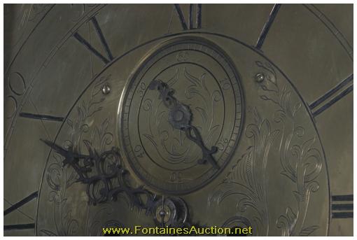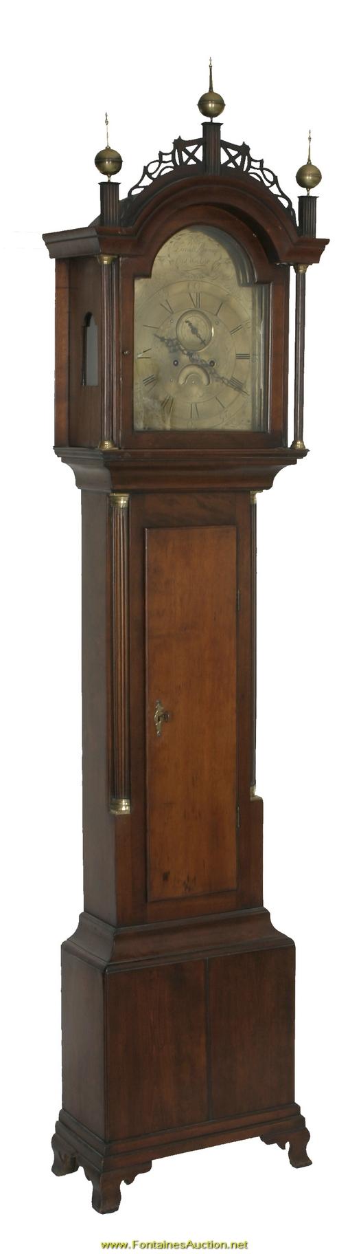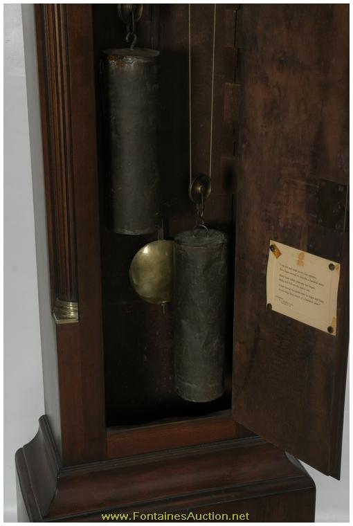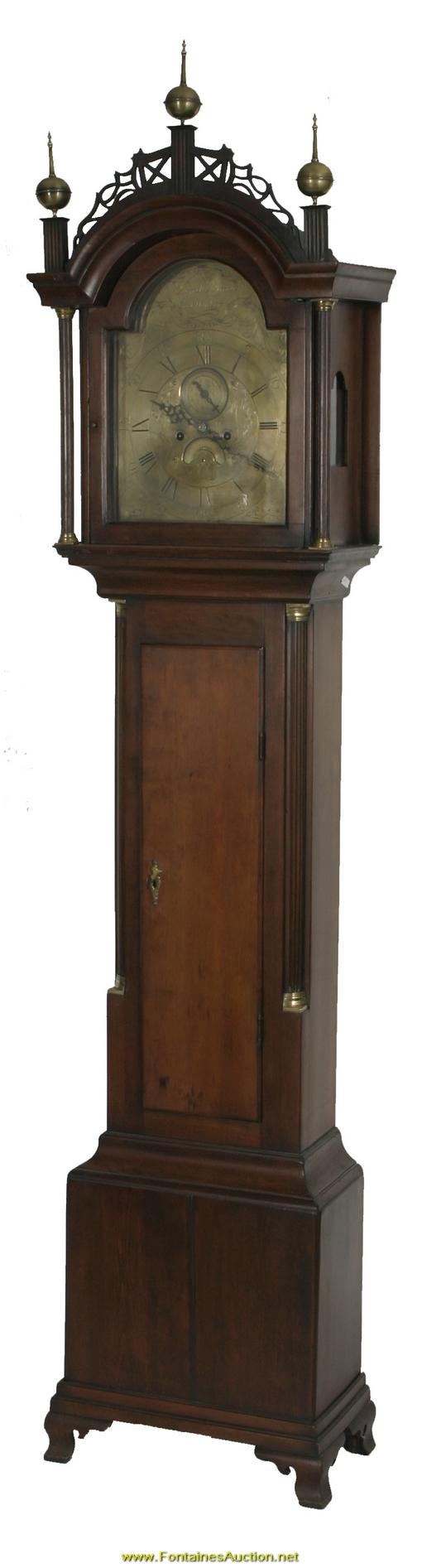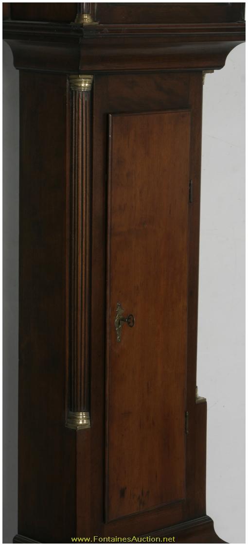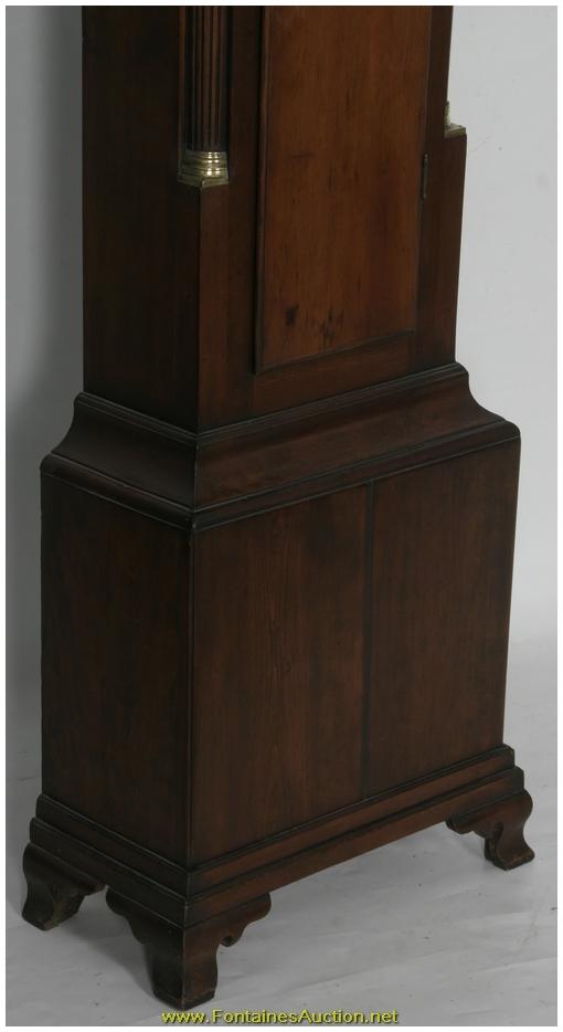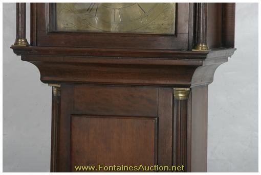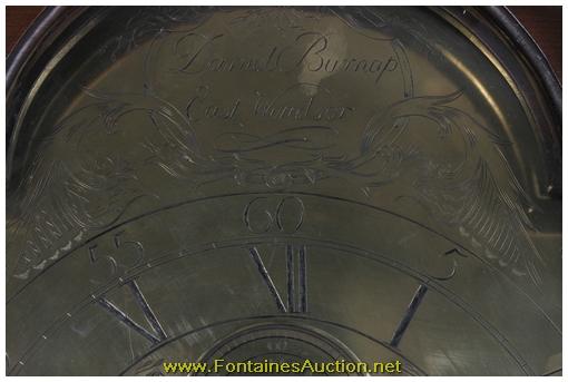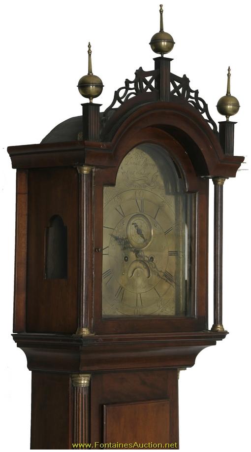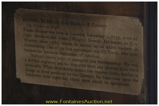 Daniel Burnap Mahogany Tall Case Clock. Engraved and polished brass dial, black Roman numerals on the chapter ring, Arabic 5 minute numerals outside, sub seconds dial, calendar bit, period pierced hands; dial signed "Daniel Burnap - East Windsor".Brass weight driven movement, time & bell strike, Deadbeat escapement; repaired crutch. Pierce carved crest with columns and spun brass finials on the bonnet, fluted quarter columns on the body with brass capitols, stands on carved feet. Possible alterations to the face including the engraving. 20"W x 91"H x 10"D. Estimated Value$10,000 - 15,000.