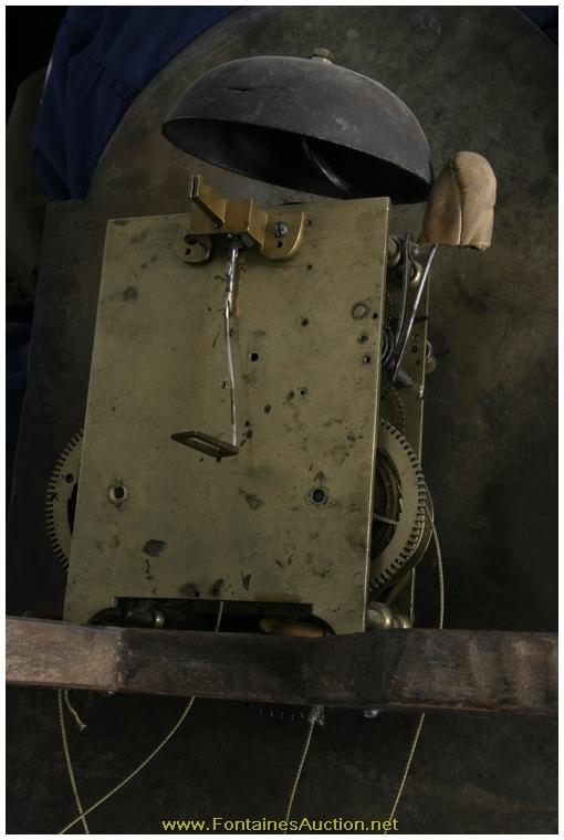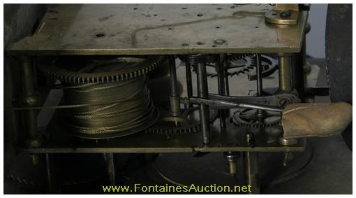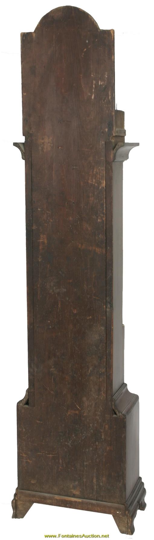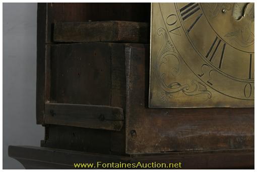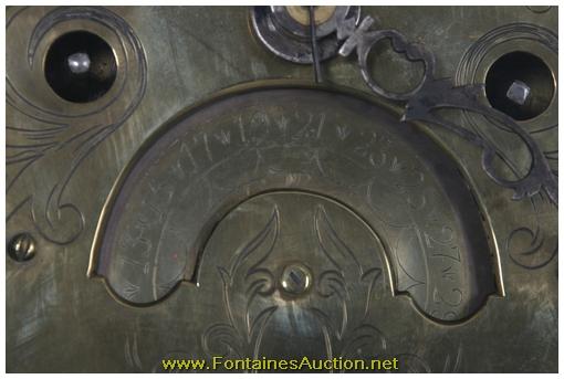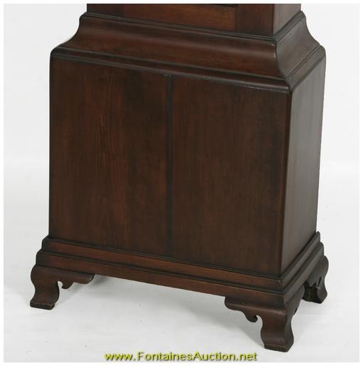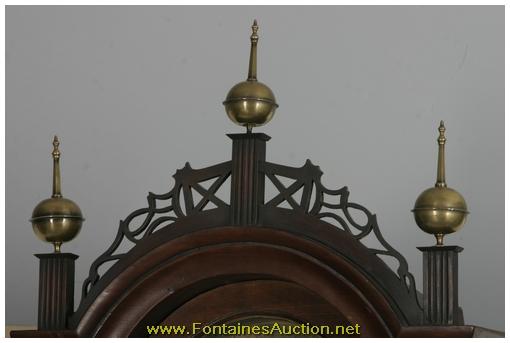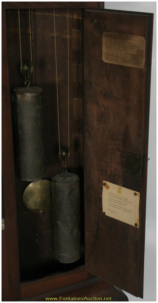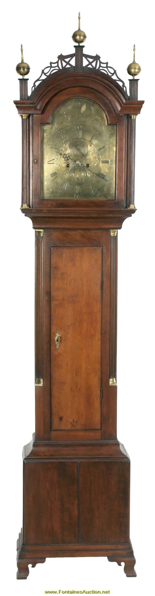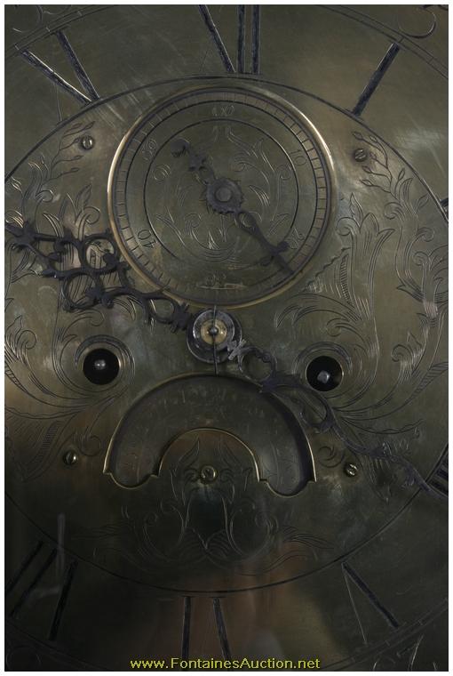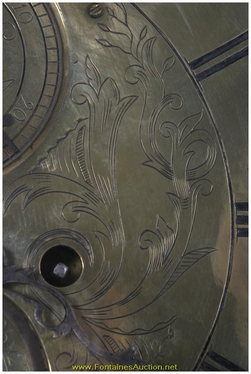 Daniel Burnap Mahogany Tall Case Clock. Engraved and polished brass dial, black Roman numerals on the chapter ring, Arabic 5 minute numerals outside, sub seconds dial, calendar bit, period pierced hands; dial signed "Daniel Burnap - East Windsor".Brass weight driven movement, time & bell strike, Deadbeat escapement; repaired crutch. Pierce carved crest with columns and spun brass finials on the bonnet, fluted quarter columns on the body with brass capitols, stands on carved feet. Possible alterations to the face including the engraving. 20"W x 91"H x 10"D. Estimated Value$10,000 - 15,000.