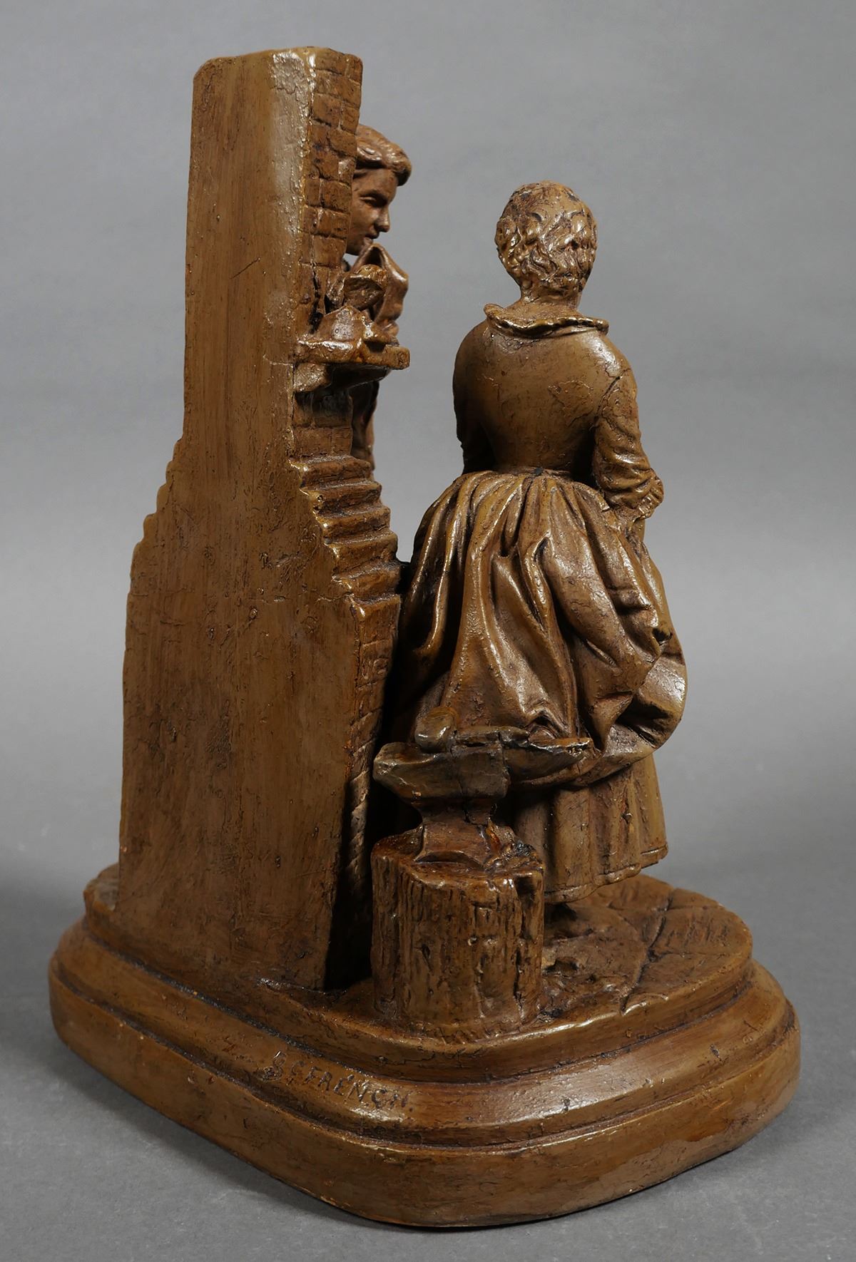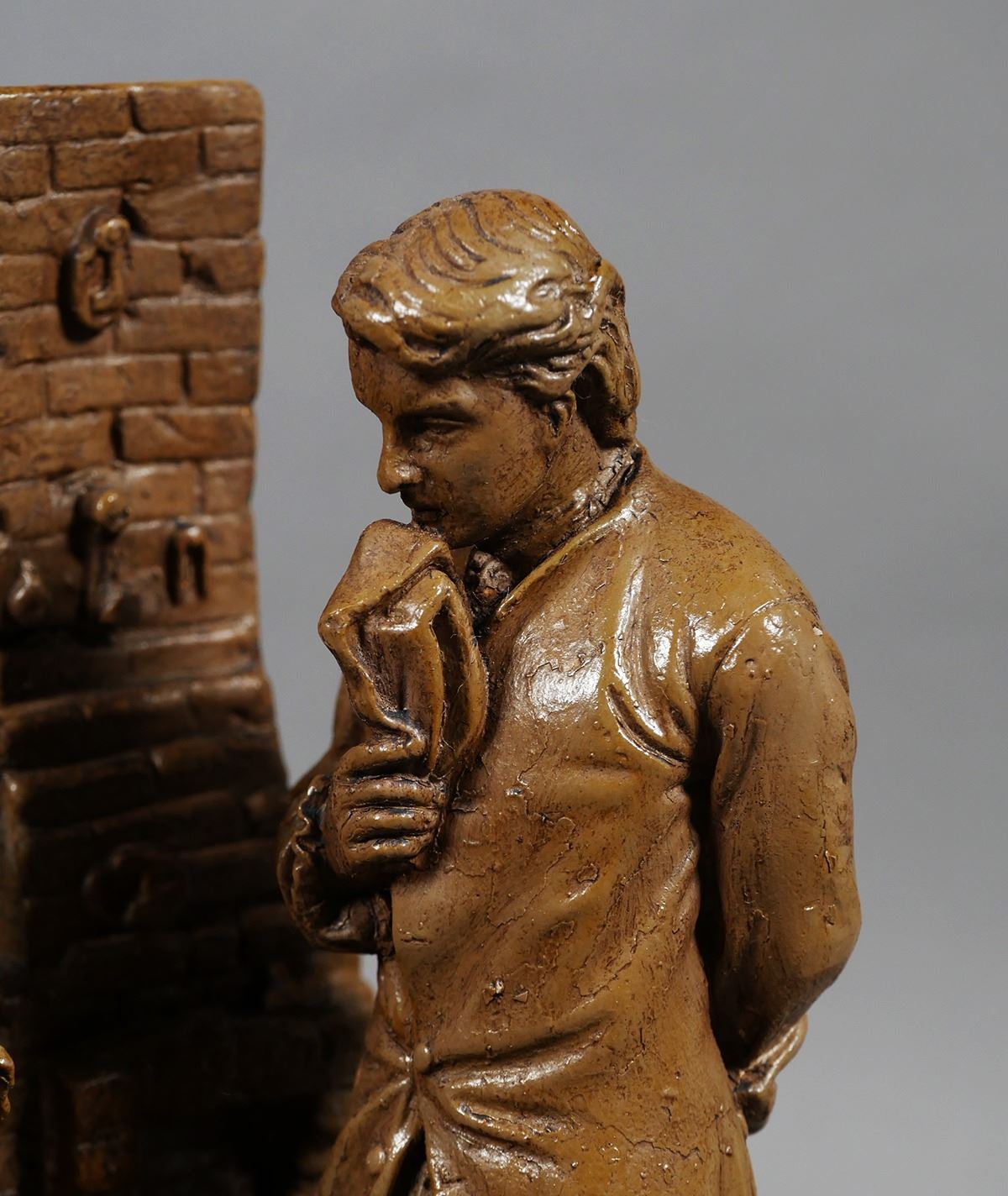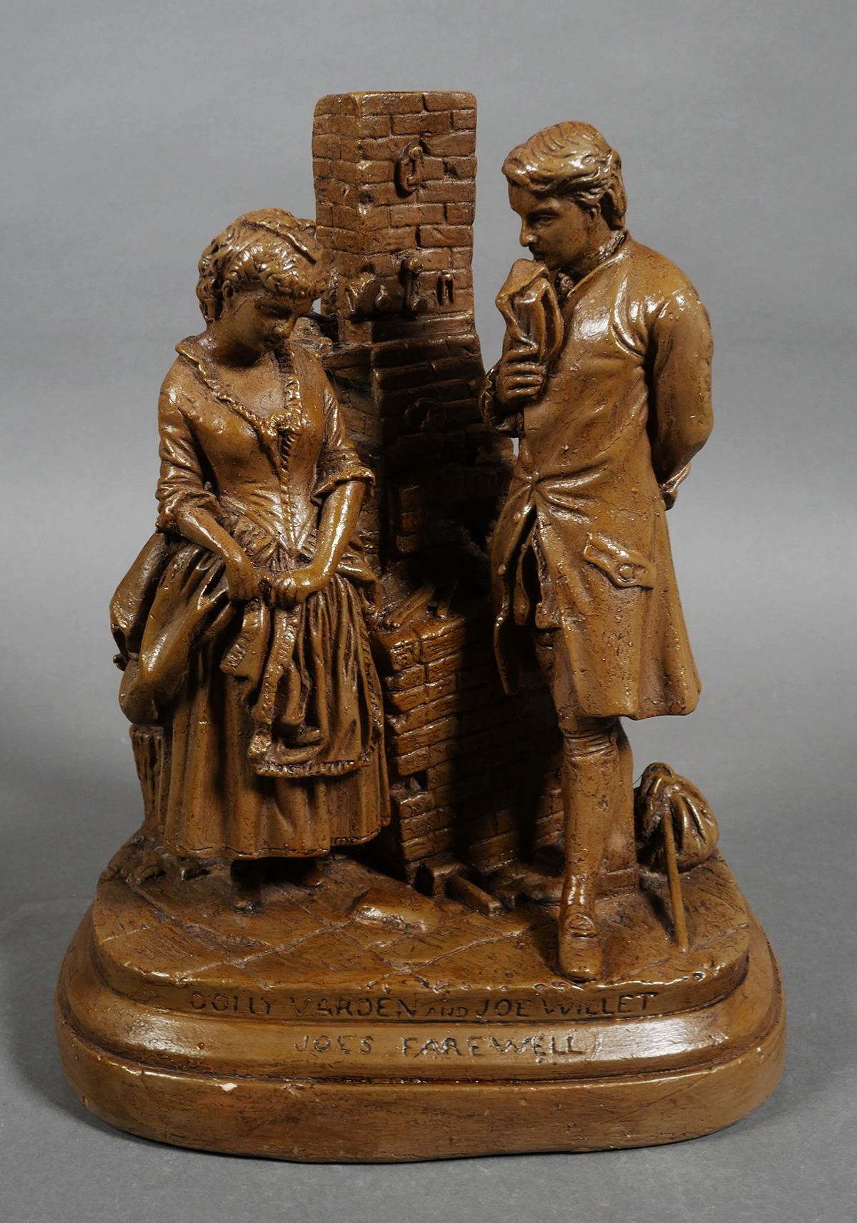 Antique, circa 1880s sculpture by Daniel C. French (American 1850-1931), ''Dolly Varden and Joe Willet, Joe's Farewell" cast sculpture, signed D. C. French on back of base. "Hennecke's Florentine Statuary" impressed stamp on bottom. 10" high. Good condition. Anvil behind Dolly reglued. Measures 9 7/8" tall x 7 1/2" wide x 5 3/4" deep.