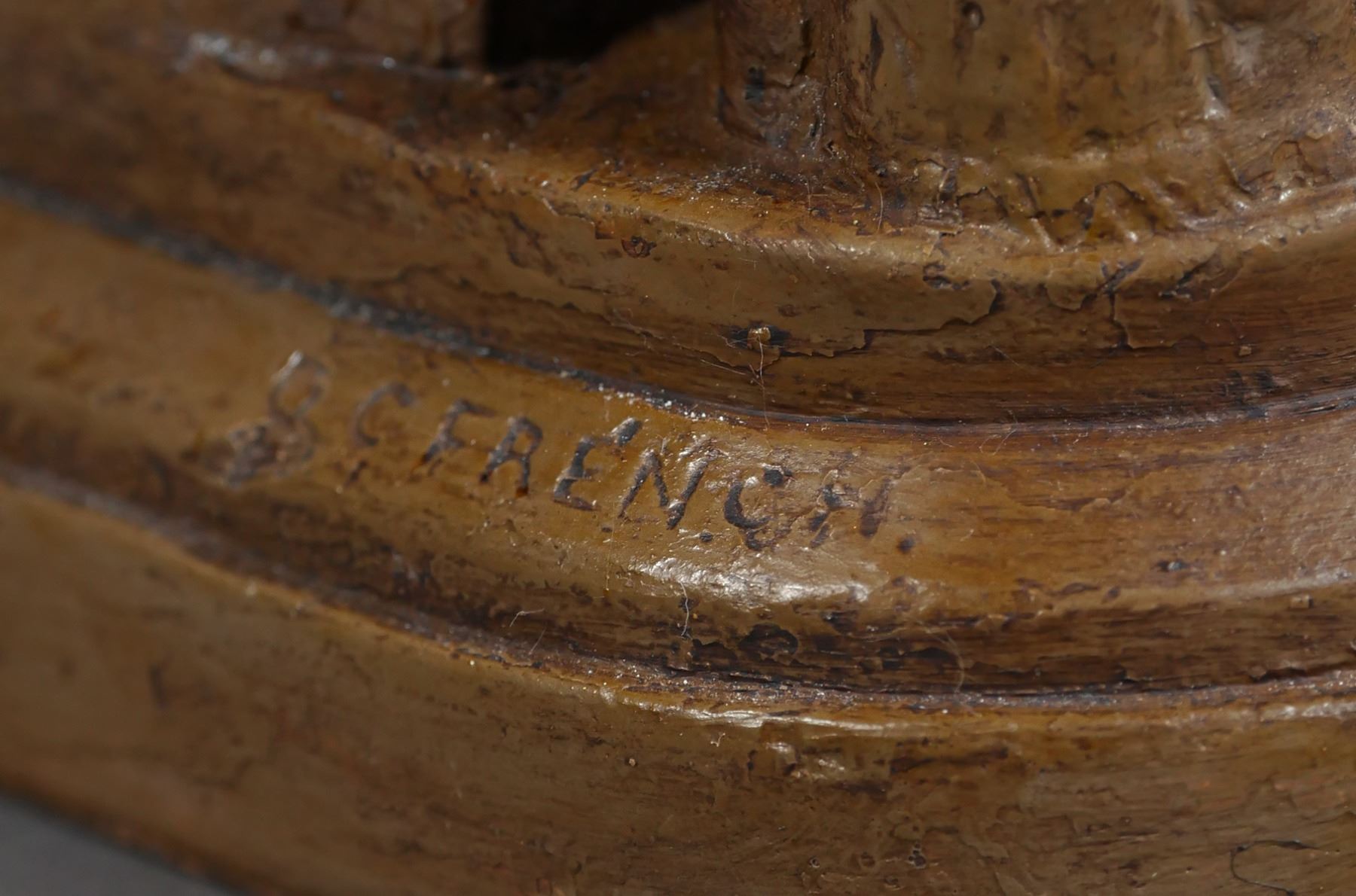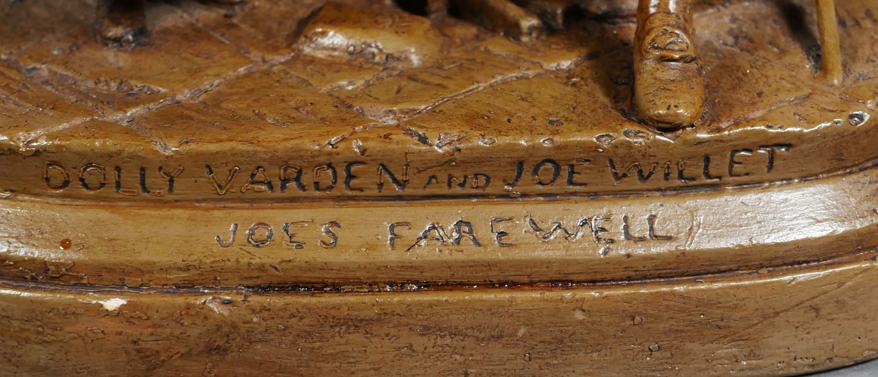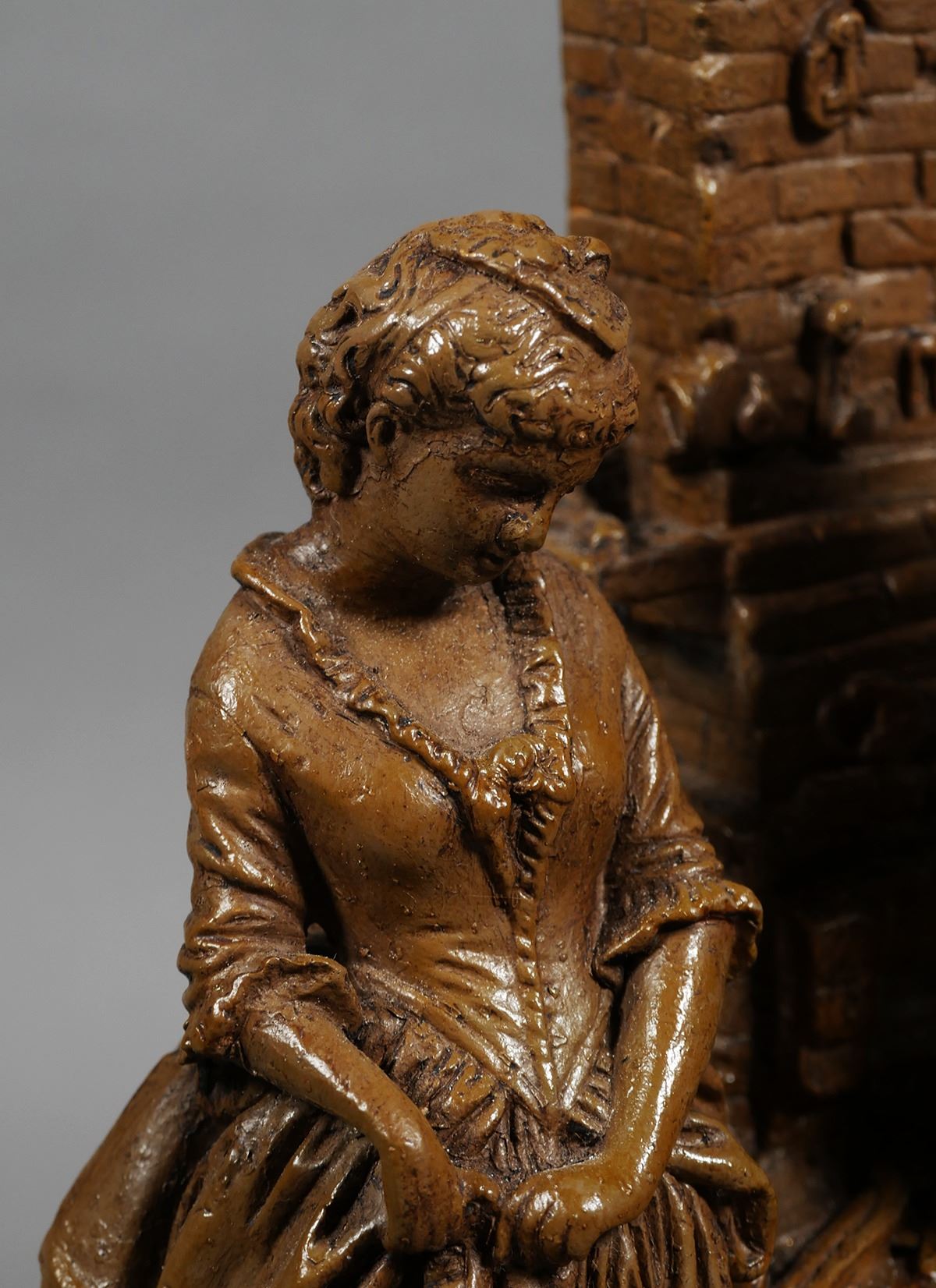 Antique, circa 1880s sculpture by Daniel C. French (American 1850-1931), ''Dolly Varden and Joe Willet, Joe's Farewell" cast sculpture, signed D. C. French on back of base. "Hennecke's Florentine Statuary" impressed stamp on bottom. 10" high. Good condition. Anvil behind Dolly reglued. Measures 9 7/8" tall x 7 1/2" wide x 5 3/4" deep.