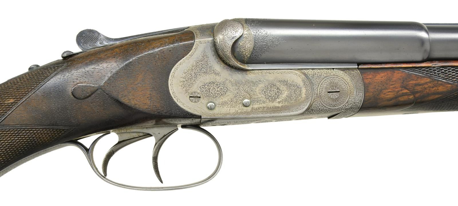 DOUBLE RIFLE WITH CASE. Cal. 450-400 3 1/4" NE. S# 3081 (CA 1899). The 27" chopper lump barrels with heavy reinforced breech area are fitted with full length matted rib. Mid portion is swamped forming front sight ramp. Rib is fitted with one standing, two nested leaf express rear sight dovetailed through and silver bead front with flip up porcelain night bead. Rib, in front of rear sight is engraved with marker's name and address. Barrel flats are stamped with London nitro proofs for 53 grains of cordite and 400 grain bullet as well as London reproofs for 60 grains of cordite. A sling eye is soldered to bottom rib. Case hardened boxlock action with extended back line in usual Fraser fashion, features bolted non automatic safety, pivoting third fastener that engages straight rib extension, bushed strikers, side clips and double triggers with checkered blades. Action is engraved with 80% coverage very well cut small scroll with rose bouquet highlights within small scroll borders. Maker's name is on each side. Top lever with more scroll is engraved "FRASER'S PATENT" around pivot. Floorplate and trigger guard are also blued and scroll engraved. S# is on trigger guard tang which extends to horn grip cap. Finely figured and well marbled European walnut pistol grip buttstock measures 14 1/2" over original checkered horn buttplate and features shadow line right hand cheekpiece, point pattern checkering, recessed sling eye and fancy vacant gold shield on toeline. Matching long splinter ejector forend has Anson release. MEASUREMENTS: STOCK: DAH: approx. 2 11/16". DAC: approx. 1 15/16". CAST: about 1/2" off. LOP: 14 1/2". WEIGHT: 9 lb. 14 oz. UNATTACHED ACCESSORIES: gun is house in what appears to be its original oak and leather case with brass corners. Top is embossed "M.C. DRAPER" interior is lined in burgandy cloth and has dark green leather gold embossed Fraser label in lid as well as a small paper Henry Atkin label. Case contains snap caps, ebony handle striker key (that does not fit), small ebony handled turn screw and another with horn handle. Also in case are three sealed boxes of older Kynoch 450-400 nitro express cartridges loaded with solid bullets in red & yellow boxes. CONDTION: fine with some minor refinishing. Barrel retaining nearly all of a "Best" reblack most likely done at time of reproof. Action retains about 30% original case hardening color, strong where protected and is mostly silver gray with some minor staining. Blued parts retain most of their charcoal blue, loss from normal had wear. Stocks retain most of their original hand rubbed oil finish with a good scattering of marks, two fairly deep on right side of butt. Checkering recut on buttstock. Bores are fine, smooth and shiny with some minor erosion at throat, action is tight, barrels are on face, ejectors are in time. Case leather shows some dark splotches, rubs and is bleaching. Straps missing, handle good, interior cloth is good, dusty, with many rubs and marks. Label is fine to very fine, accessories are good. (22-5831/MGM). CURIO. $8,000-12,000.