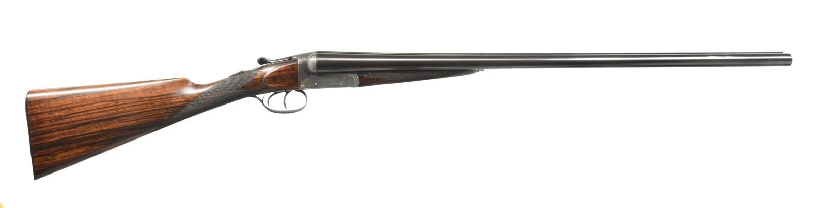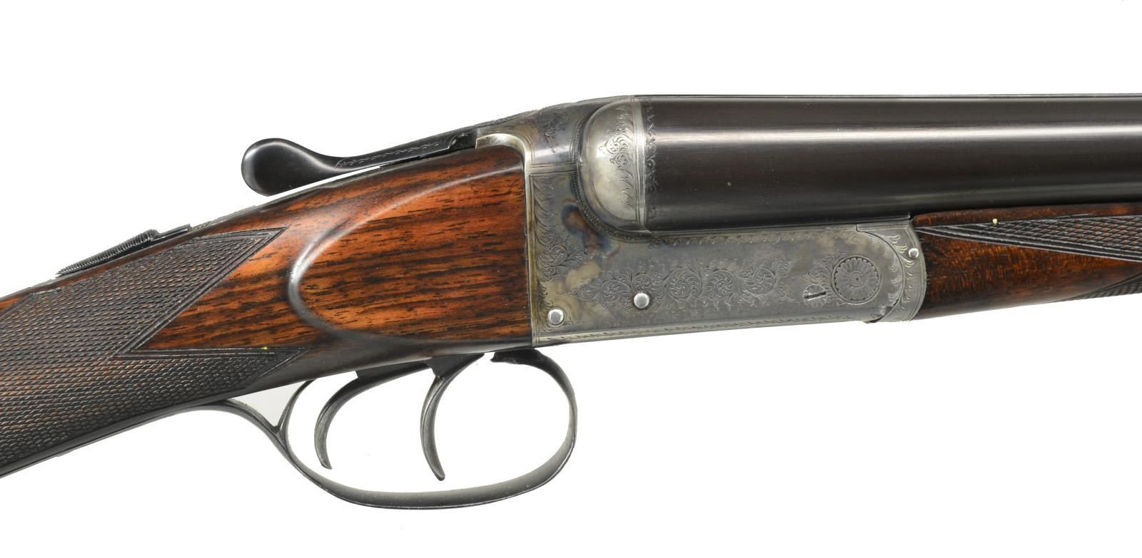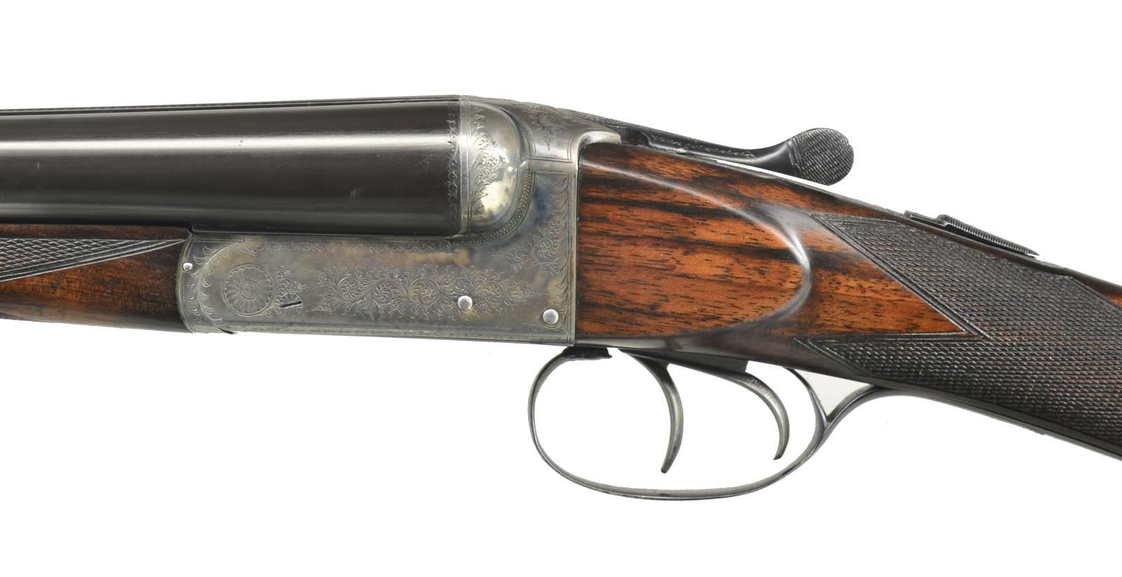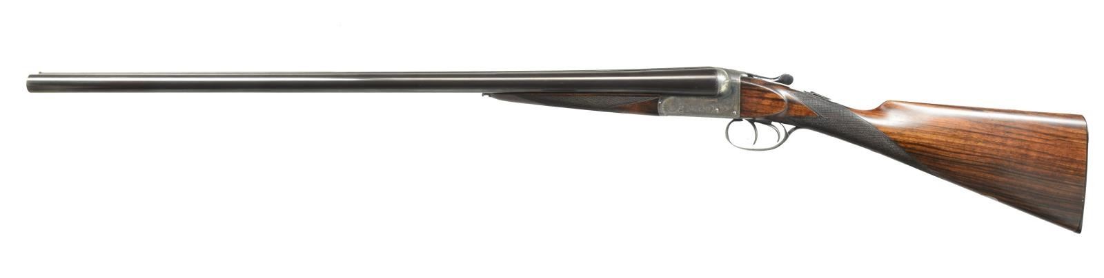 Cal. 12 Ga., 2 3/4". S# 47785. Bbls. 28" dovetailed are marked "DANIEL FRASER. LEITH, EDINBURGH." in unmatted portion of unmatted swamped game rib w/ extension. Bbl. flats are stamped w/ Birmingham nitro proofs for 2 1/2" chambers. Bottom of left bbl. is stamped w/ actual maker's mark "CO" (Charles Osbourne). His number is on bottoms of bbls., action & trigger guard tang (corresponding to approx. date of manufacture of 1924). Case hardened boxlock action features automatic safety, pivoting 3rd fastener & dbl. triggers. Action engraved w/ 50% coverage scroll. Blued top lever floorplate & trigger guard are also scroll engraved. Well streaked, dense European walnut straight grip buttstock measures 14 1/2" over serrated horn buttplate. Stock features side panels, point pattern grip checkering & vacant silver oval on toeline. Matching splinter ejector forend has Anson release. MEASUREMENTS: BARRELS: Bore diameter: R .728, L .728. Restriction: R .003 (IC), L .037 (FULL). Min. Wall Thickness: R .034, L .032. STOCK: LOP: 14 1/2". DAC: 1 1/2". DAH: 2 1/4". Cast: 3/8" off. WEIGHT: 6 lbs. 11 oz. CONDITION: fine as partially & attractively refinished. Bbls. retaining over 90% good quality rust reblue over a few scattered nicks. Action retains 40-50% original case hardening color, silvered on high edges from normal hand wear. Top lever, floorplate & trigger guard reblued, slightly silvered on thumb piece & at grip. Stocks retain nearly all of an old oil refinish. Edges slightly rounded, checkering w/ some wear. There are a scattering of minor subsequent marks, mostly on butt. Bores appears to be very fine, but dirty. Action is tight. Bbls. are on face. Ejectors are in time. (20-2874/MGM92). CURIO. $1,500-2,200.